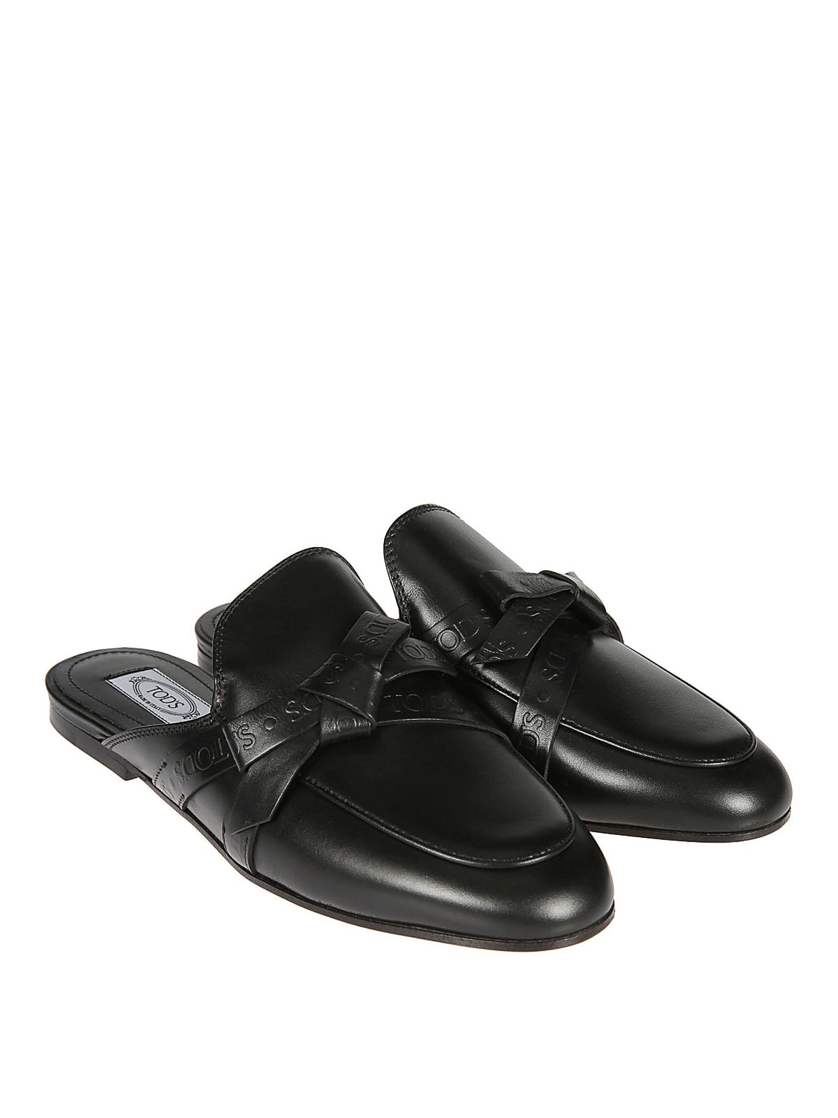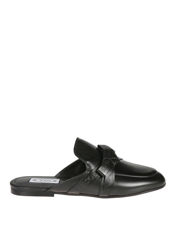 Expertly crafted by TOD'S, these black leather mules feature a delicate bow detail, adding a touch of elegance to any outfit. Made with high-quality materials, these mules provide comfort and style in one. Perfect for any occasion, they are a must-have for any wardrobe.
