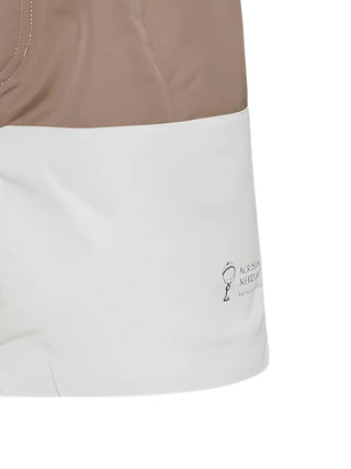 Brunello Cucinelli Mens Brown & White Color Block Logo- Embroidered Swim Trunks
