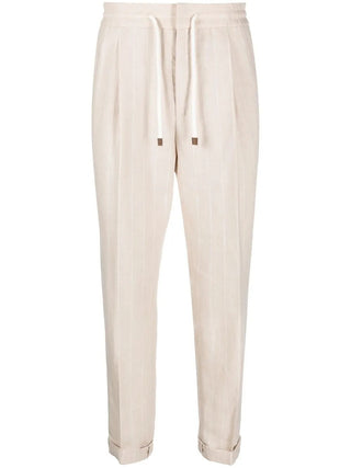 Brunello Cucinelli Men's Beige Linen & Wool White Pinstriped Drawstring Pant