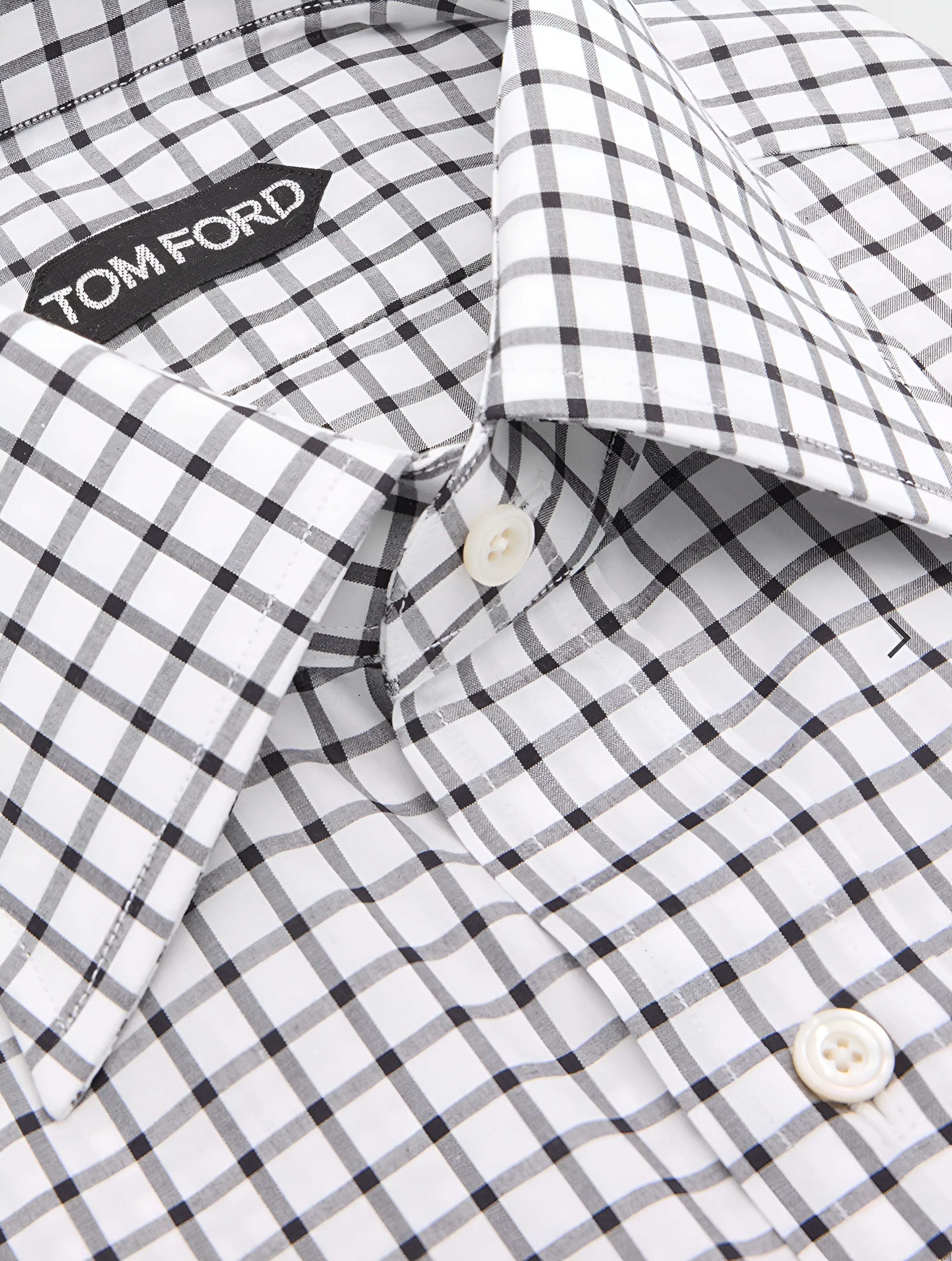 This stylish Tom Ford button down dress shirt features a timeless black and white checkered pattern. With its high-quality construction and classic design, it is sure to elevate any man's wardrobe. Made for the modern gentleman, this shirt exudes sophistication and style.