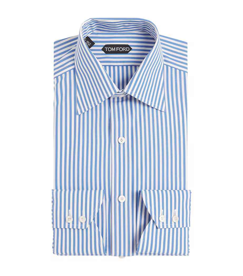 Elevate your wardrobe with the Tom Ford Men’s Light Blue Striped Button Down Dress Shirt. This premium shirt features a classic button down design with elegant light blue stripes. Made from high-quality materials, it offers comfort and style for any occasion. Perfect for the modern man who wants to make a statement.
