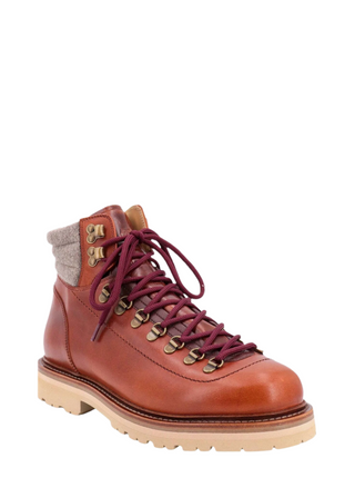 Brunello Cucinelli Mens Brown Leather Boots w Engraved logo & Grey Wool Insert