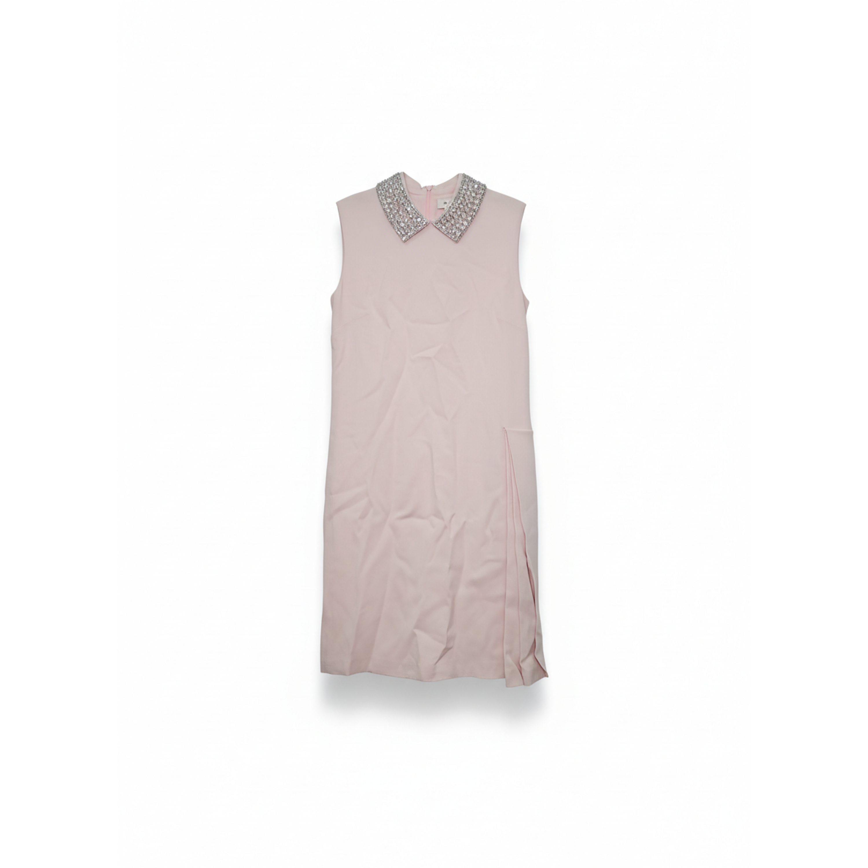 Refined and elegant, this Christian Dior sleeveless dress is designed in a soft pastel pink tone for a timeless, feminine look. The standout feature is its embellished pointed collar, adorned with sparkling crystal-style accents that add a touch of couture sophistication. Finished with a sleek straight silhouette and a subtle side slit for ease of movement, this piece transitions effortlessly from formal daytime events to elegant evening occasions.