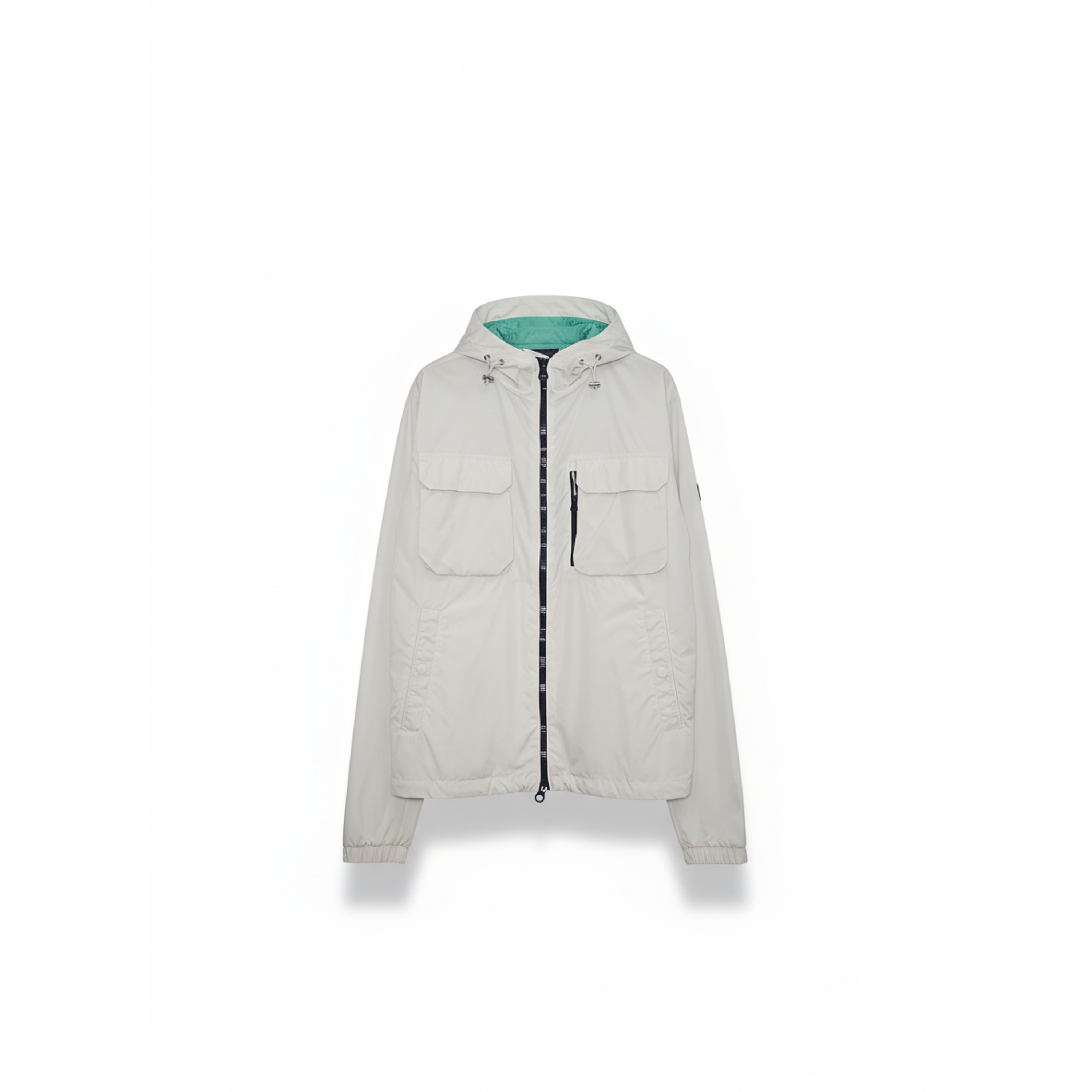 This men's hooded jacket is crafted from a lightweight technical fabric in a versatile off-white hue. It features a practical design with a full zip front, multiple utility pockets including chest flaps, and an adjustable hood with a contrasting green lining, making it ideal for casual layering.