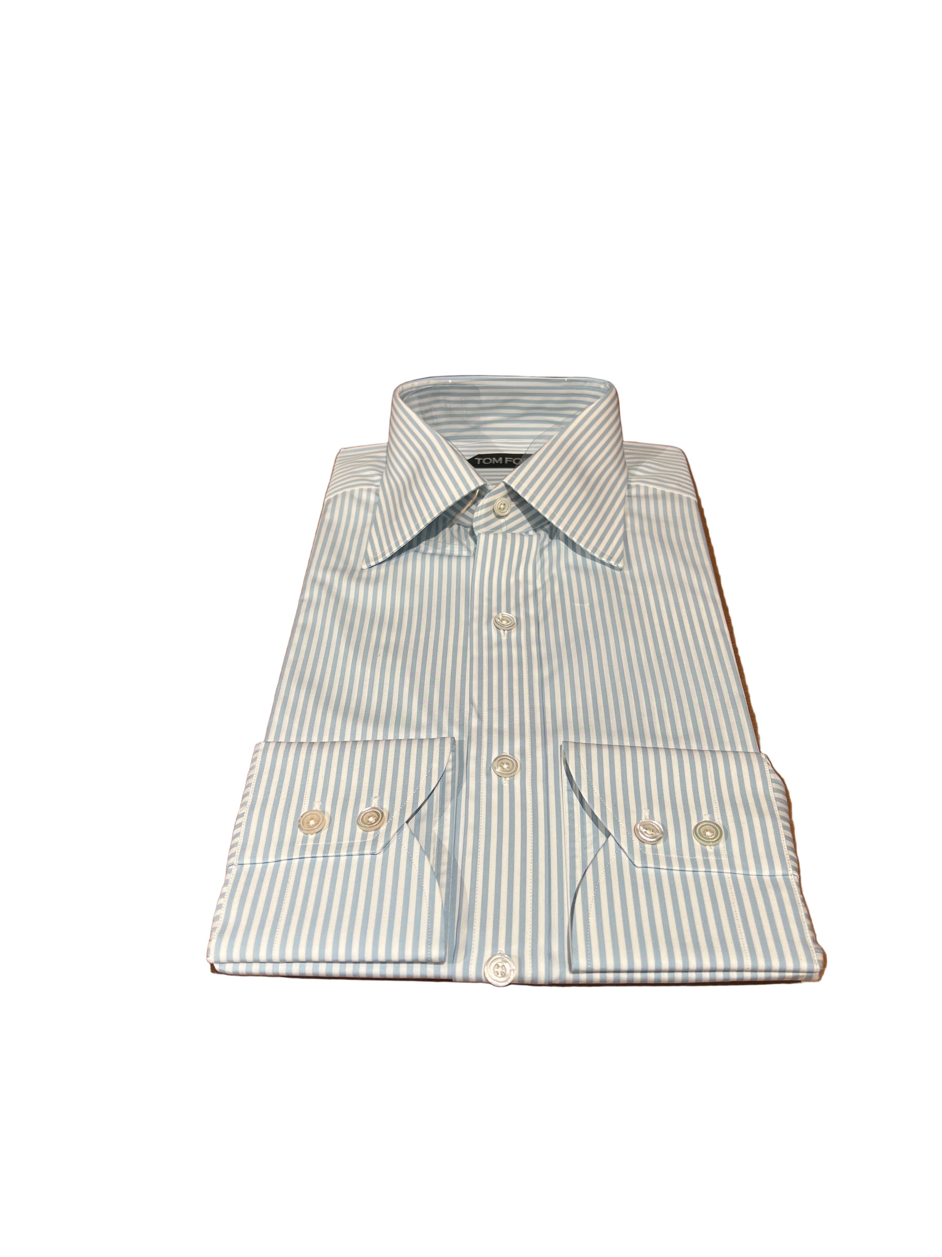 Elevate your wardrobe with the Tom Ford Men's Light Blue Striped Button Down Dress Shirt. This premium shirt features a classic button down design with elegant light blue stripes. Made from high-quality materials, it offers comfort and style for any occasion. Perfect for the modern man who wants to make a statement.