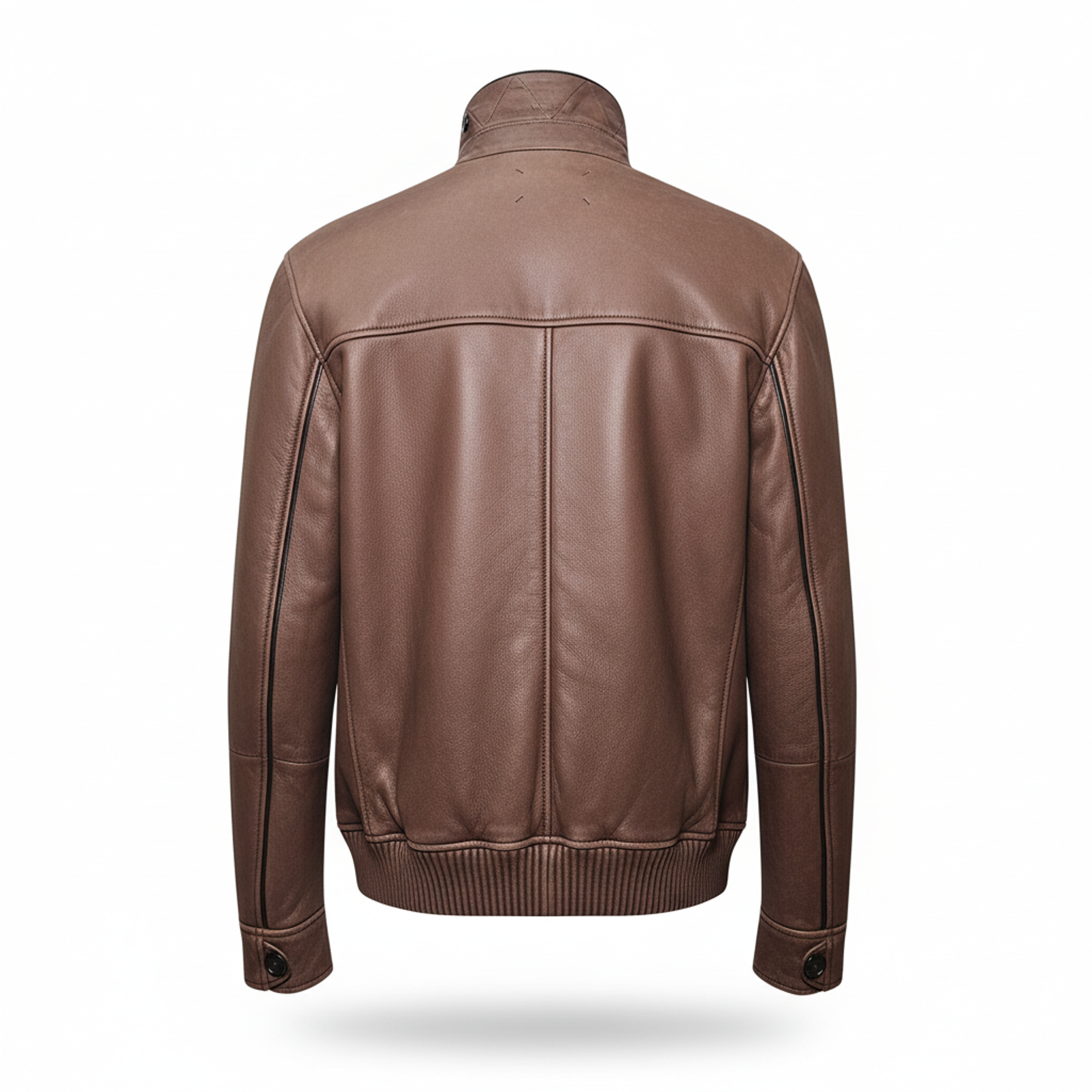 This jacket is crafted from rich, grained brown leather for a classic, luxurious feel. Its bomber silhouette, complete with a ribbed hem and a shearling-lined stand collar, offers both warmth and timeless style.
