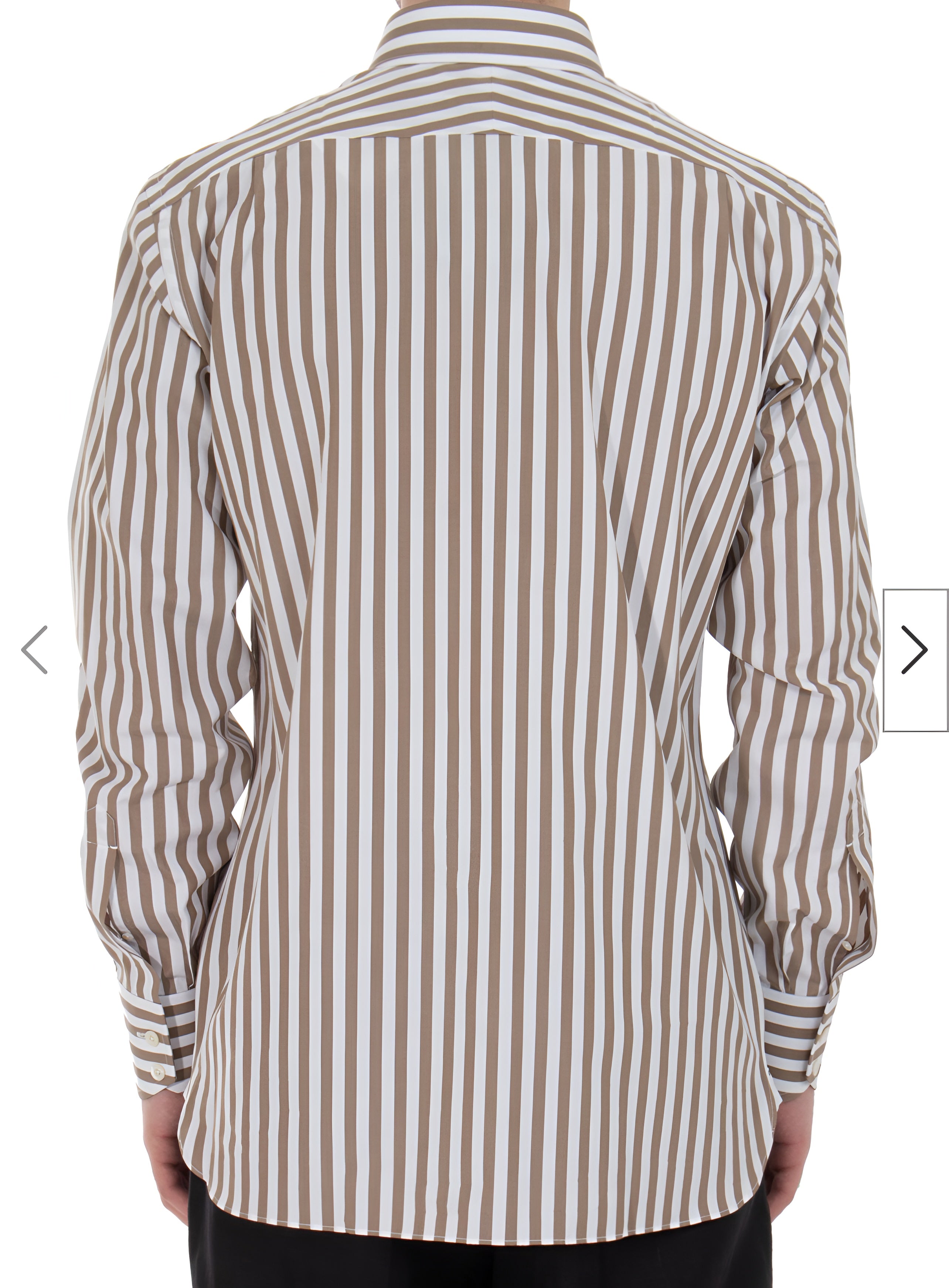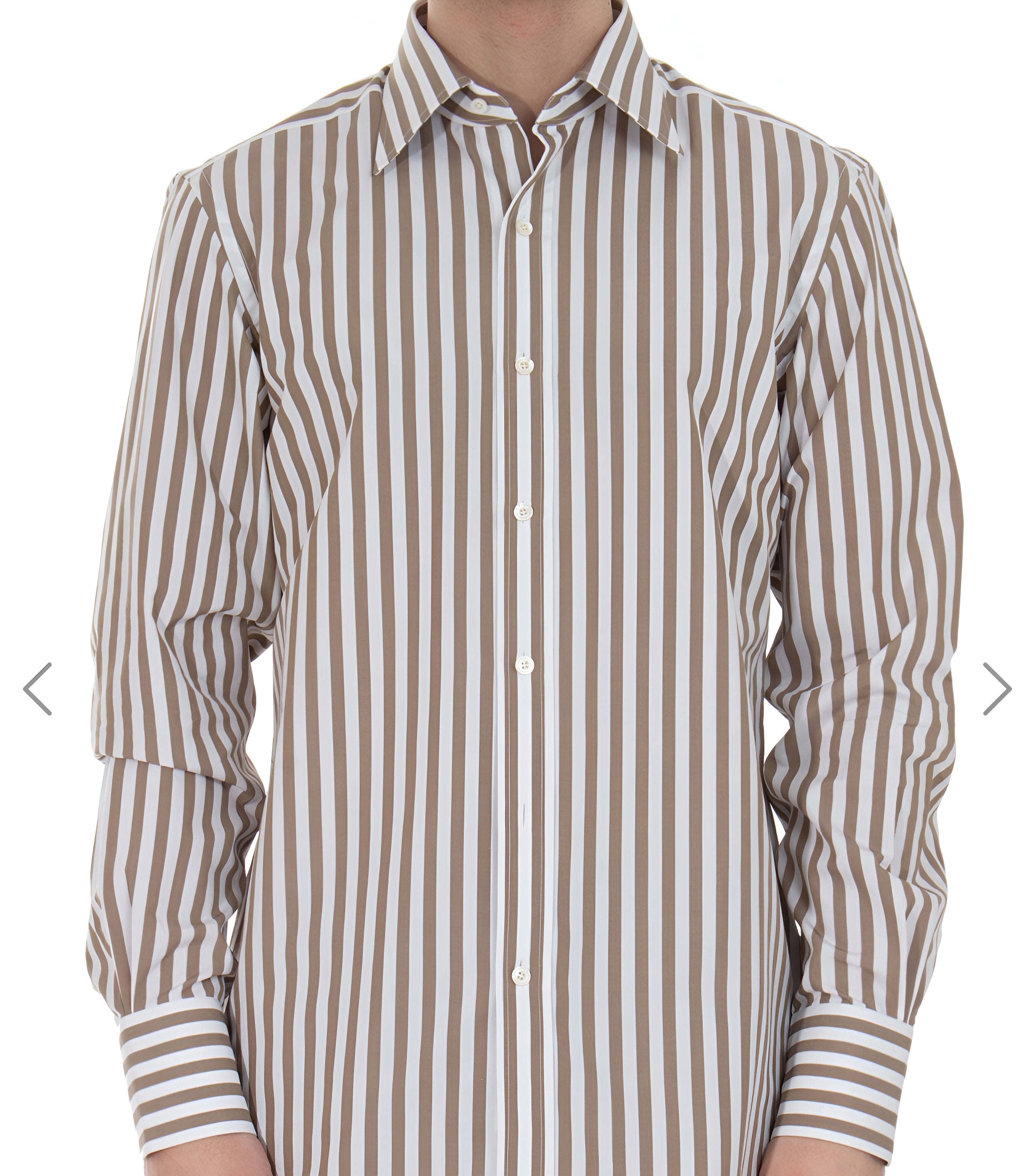 Expertly crafted from high-quality cotton, the Tom Ford Brown & White Bengal Striped Button Down Dress Shirt showcases a refined and classic style. The meticulously placed stripes create a slimming effect, while the button down design adds versatility for both formal and casual occasions. Elevate your wardrobe with this timeless piece.