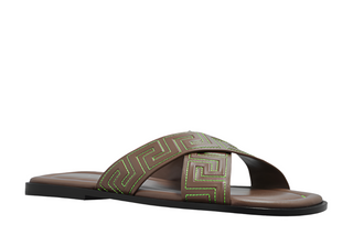 Versace Mens Brown Embroidered Sandals with Greek Pattern & Stitching