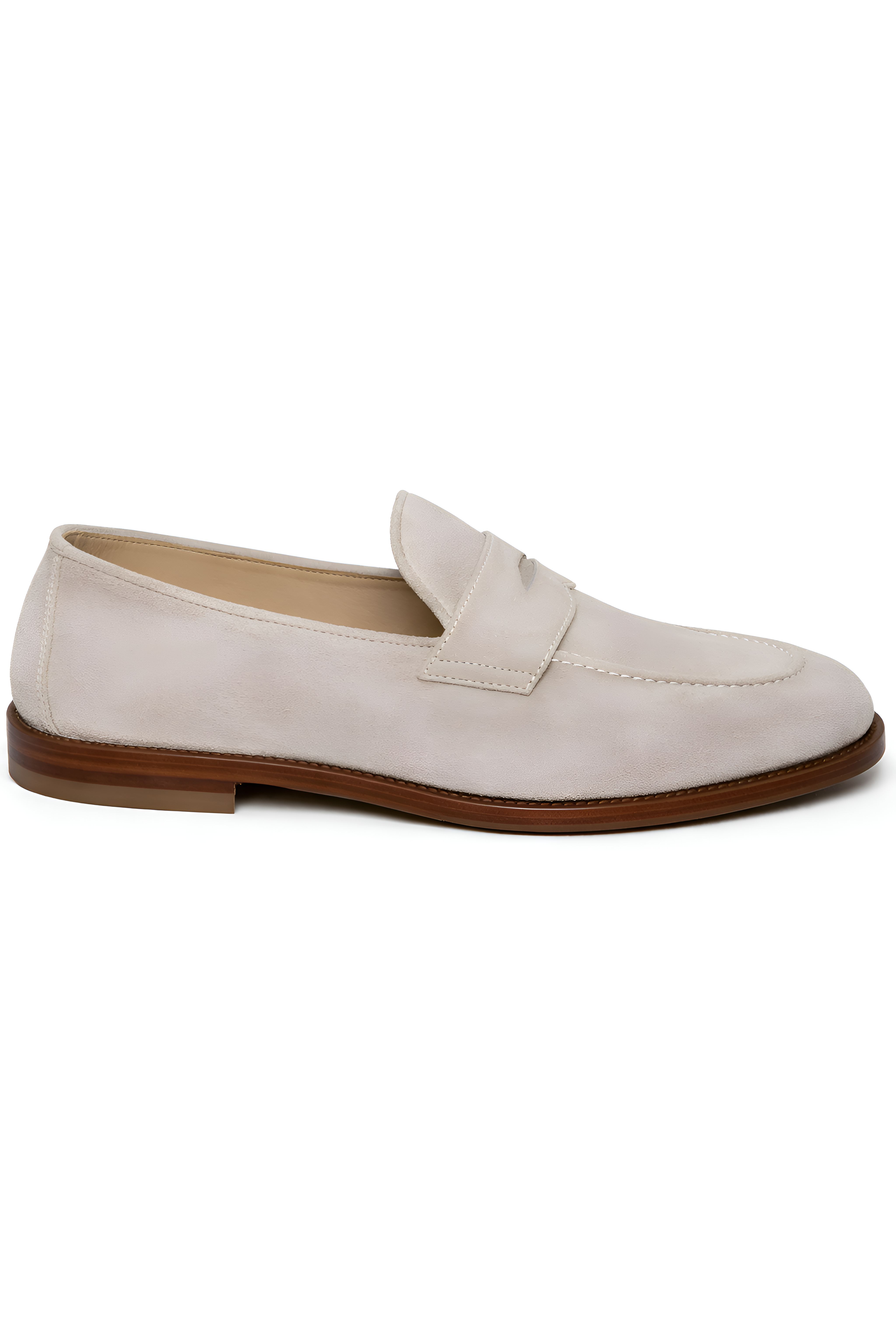 These Brunello Cucinelli loafers are crafted from supple suede, offering a refined and versatile footwear option. Featuring the iconic penny slot strap across the vamp and subtle moccasin-style stitching, they are set on a classic leather sole, perfect for an elevated casual or smart-casual look.