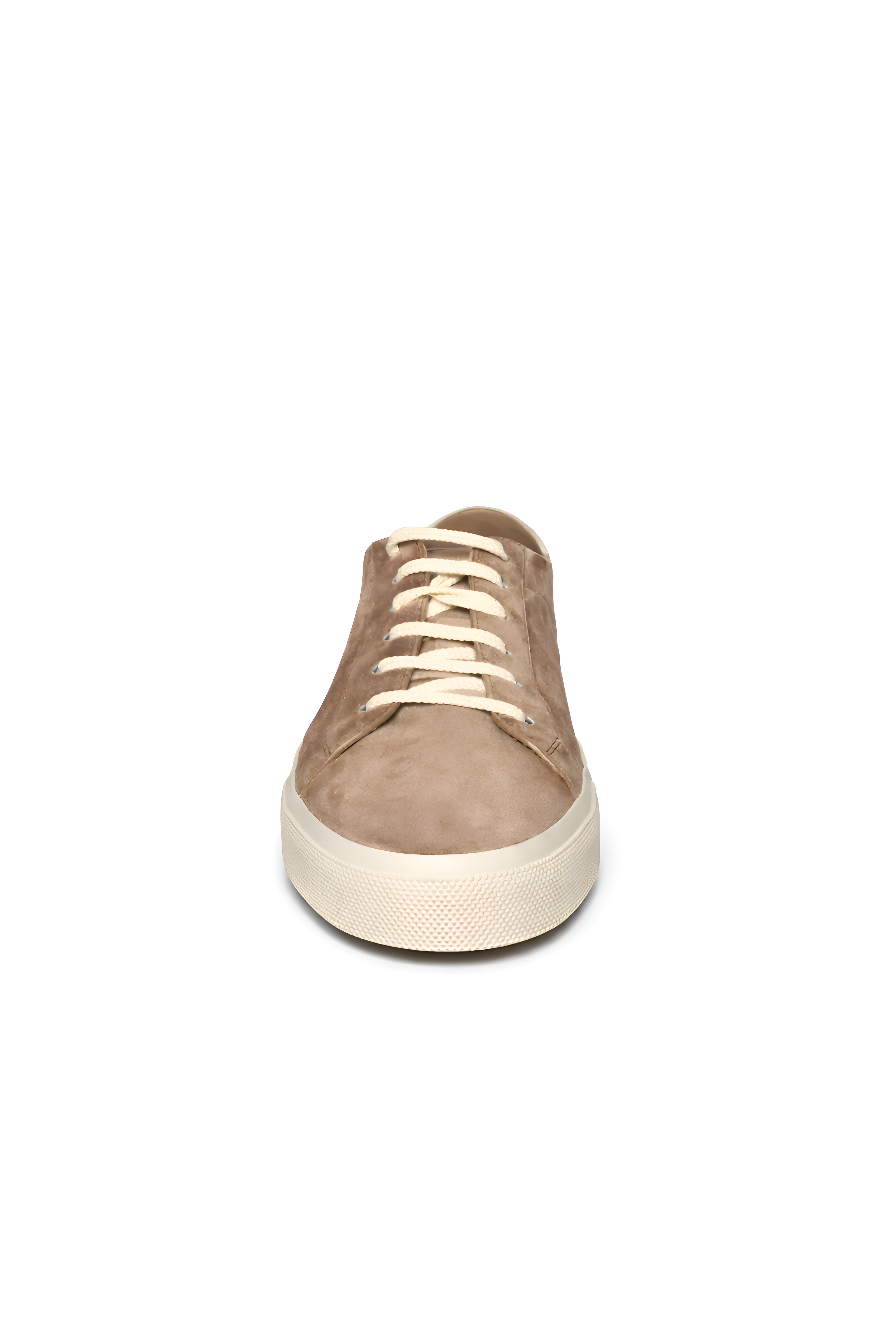 These minimalist low-top sneakers are crafted from soft brown suede, offering a refined and versatile footwear option. The clean panel construction and tonal stitching enhance the streamlined silhouette, while contrasting cream laces and a textured rubber sole add subtle dimension. Designed for effortless pairing with tailored trousers or relaxed denim, this pair embodies understated luxury.