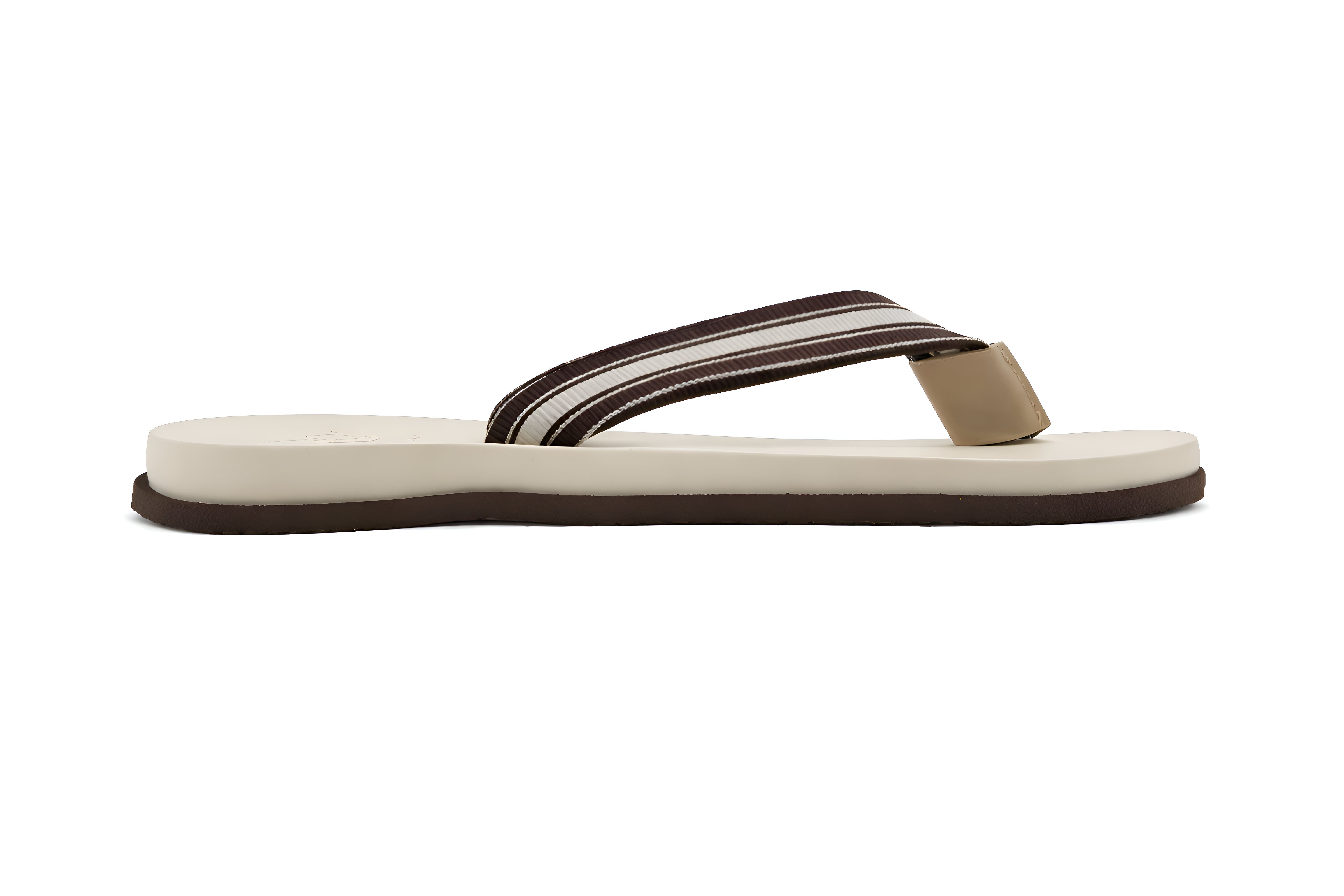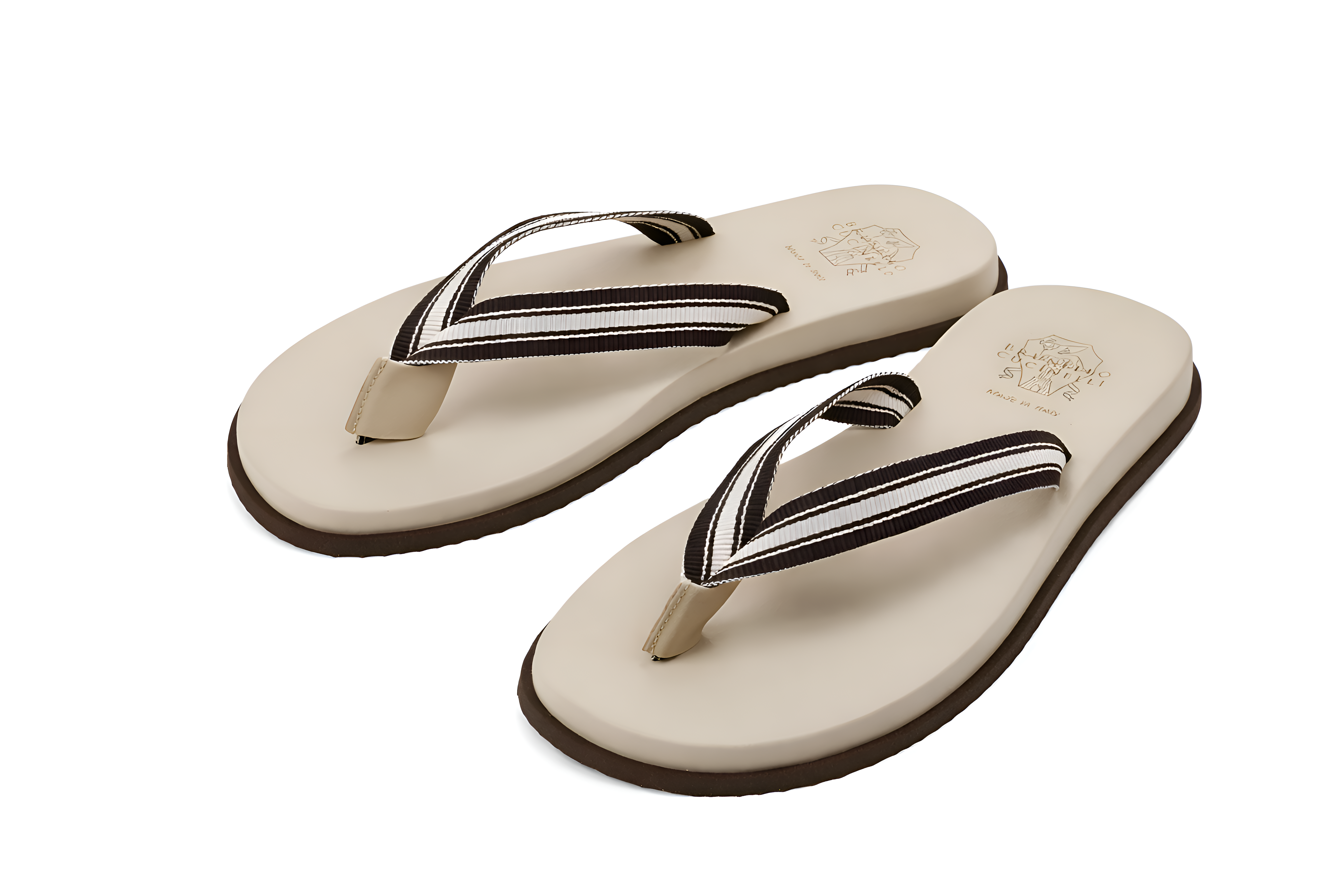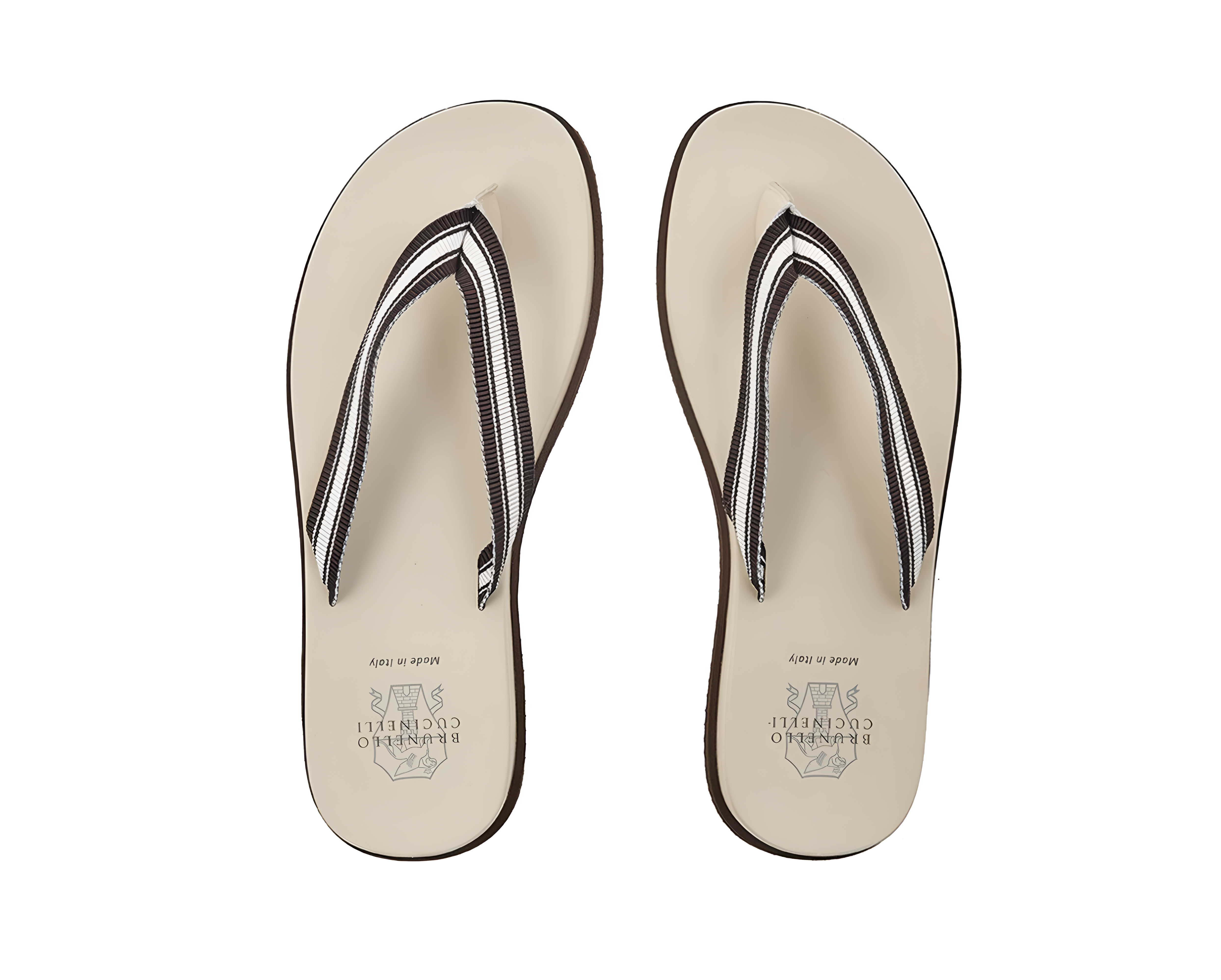 These Brunello Cucinelli thong sandals reflect effortless summer refinement with a relaxed, resort-inspired design. The minimalist silhouette features a smooth neutral footbed complemented by a striped fabric thong strap in deep brown and ivory tones. Lightweight and comfortable, the sandal is finished with a slim rubber sole, making it ideal for warm-weather leisure and coastal elegance.