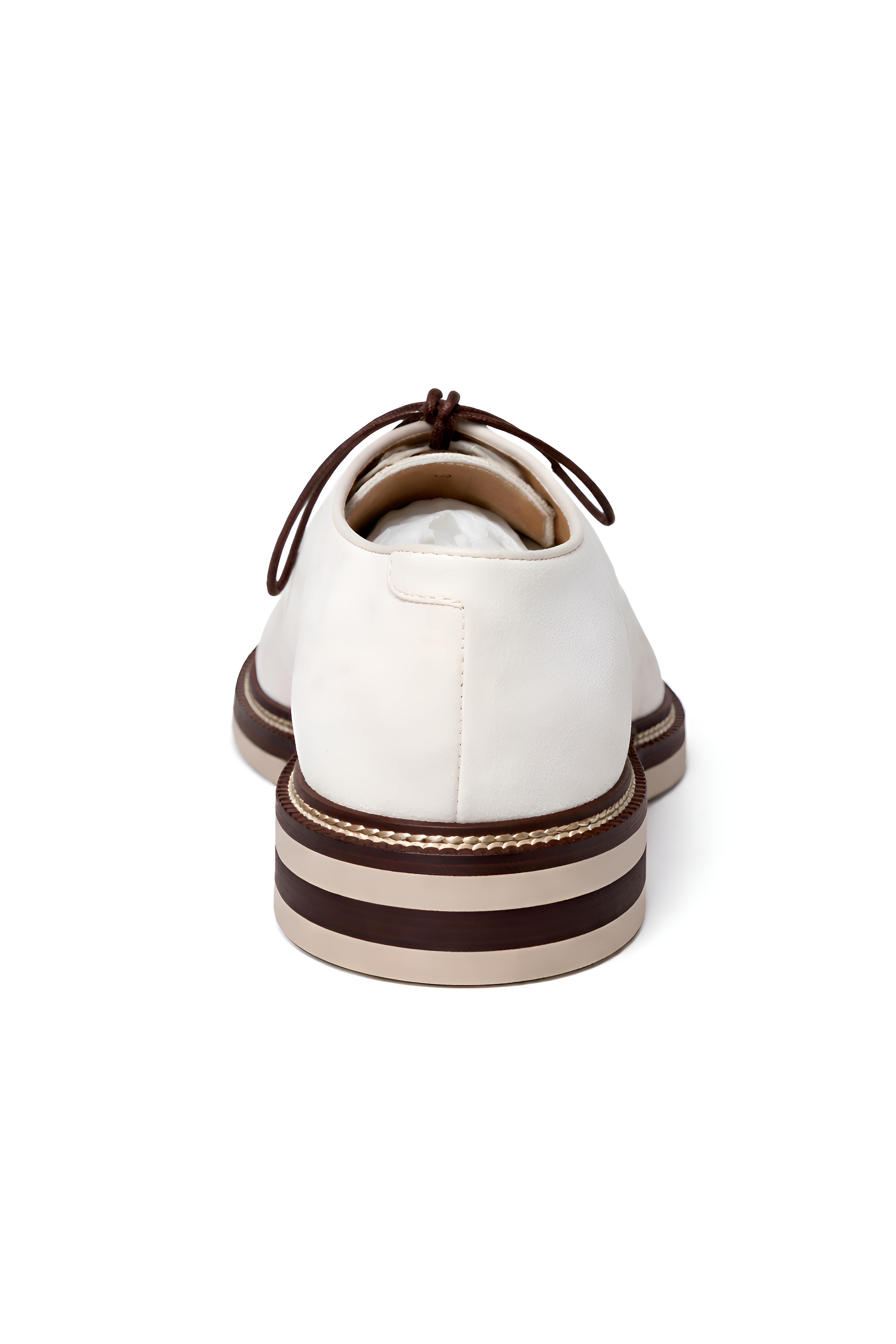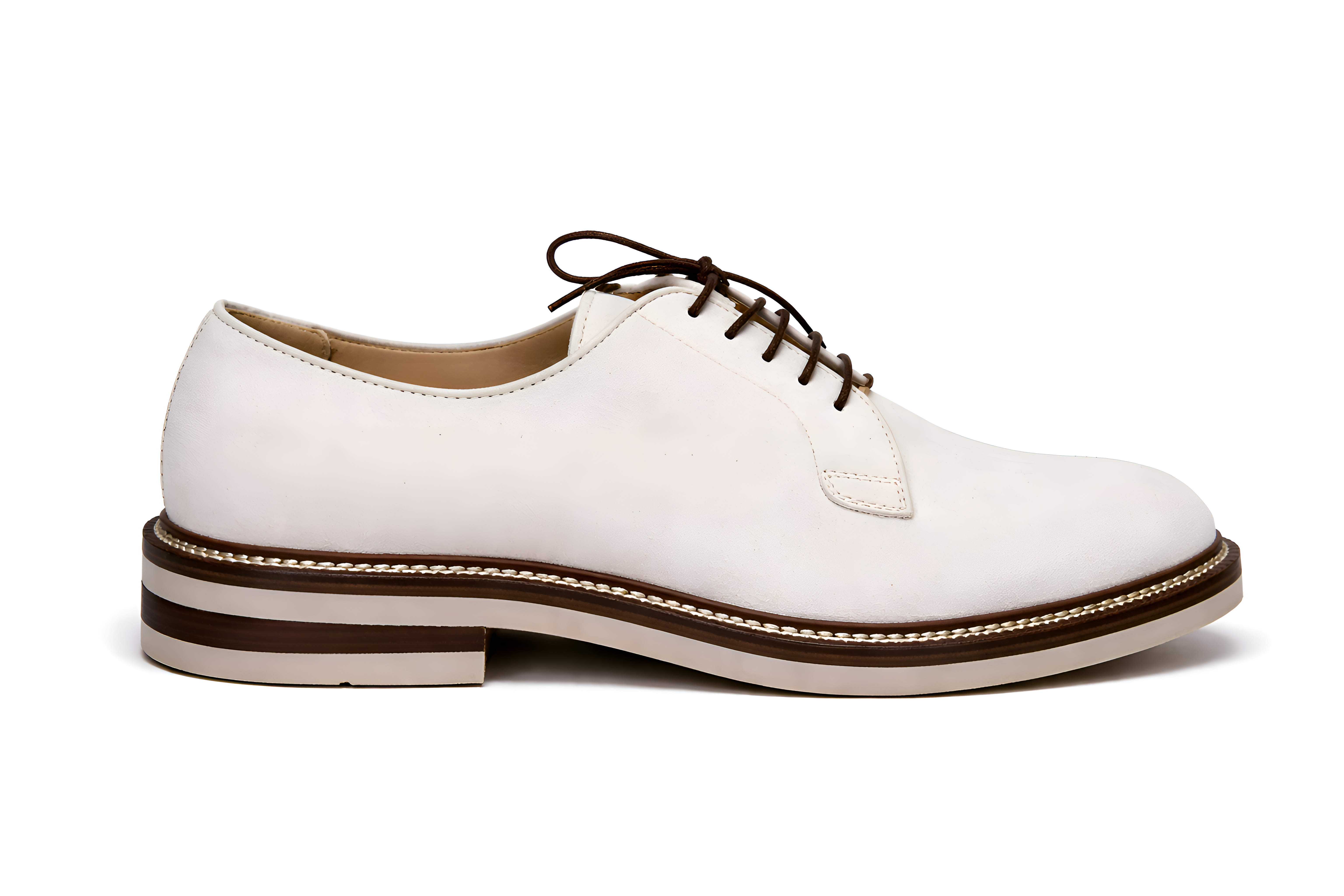 Crafted from soft off-white suede, these derby shoes offer a clean and modern aesthetic. The design is detailed with contrasting brown laces and a robust, layered sole, making them a versatile option for smart-casual wear.