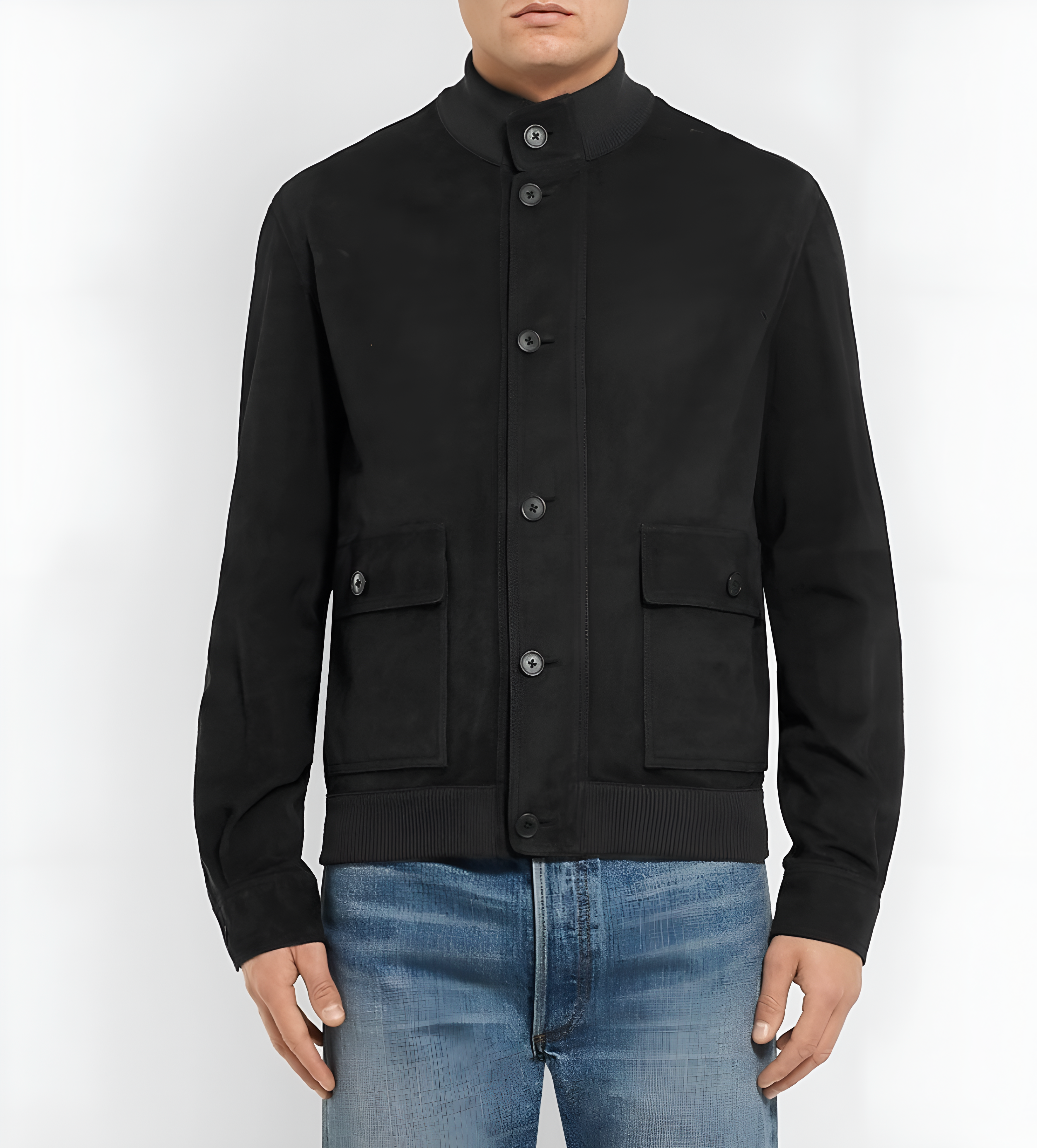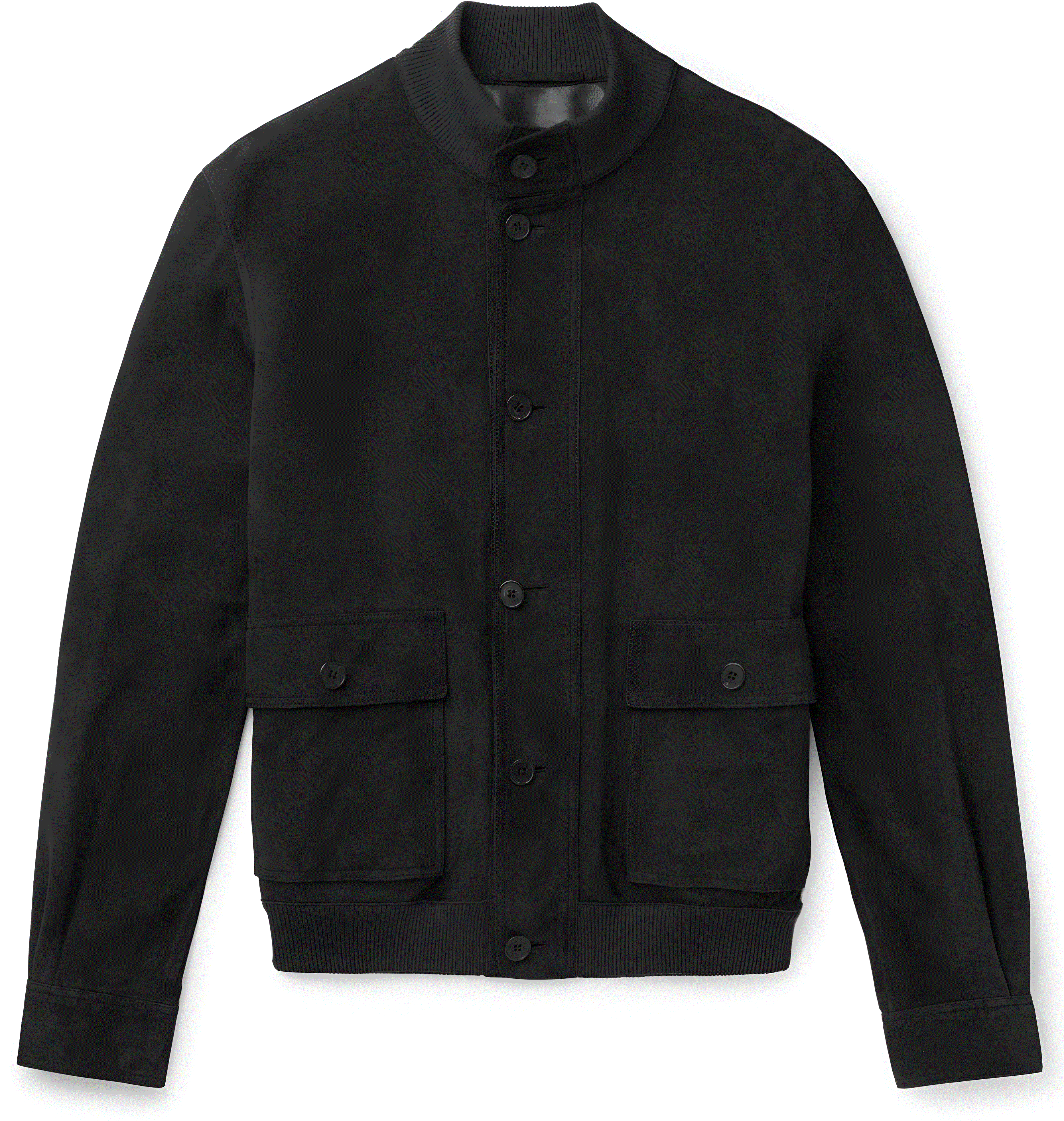 This refined bomber jacket from The Row offers a minimalist, elevated interpretation of a classic utility silhouette. Rendered in a deep black tone, it features a clean button-front closure and a structured stand collar for a polished finish. Large flap pockets at the front nod to functional military styling, while ribbed knit trim at the hem subtly enhances the shape. The overall design reflects The Row’s signature understated luxury and impeccable tailoring.