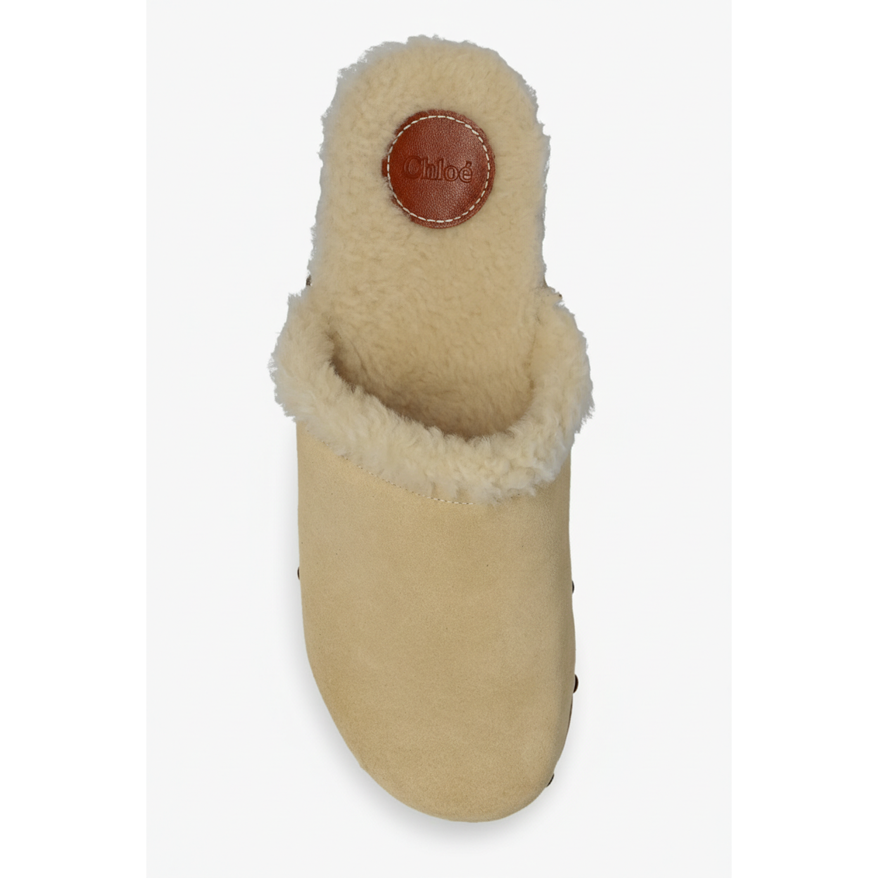 This women's footwear takes the form of a chic clog, meticulously crafted from soft beige suede and lined with plush shearling for warmth. It is elevated by a sturdy wooden platform and heel, detailed with polished studs along the welt, blending casual comfort with a refined, bohemian aesthetic.