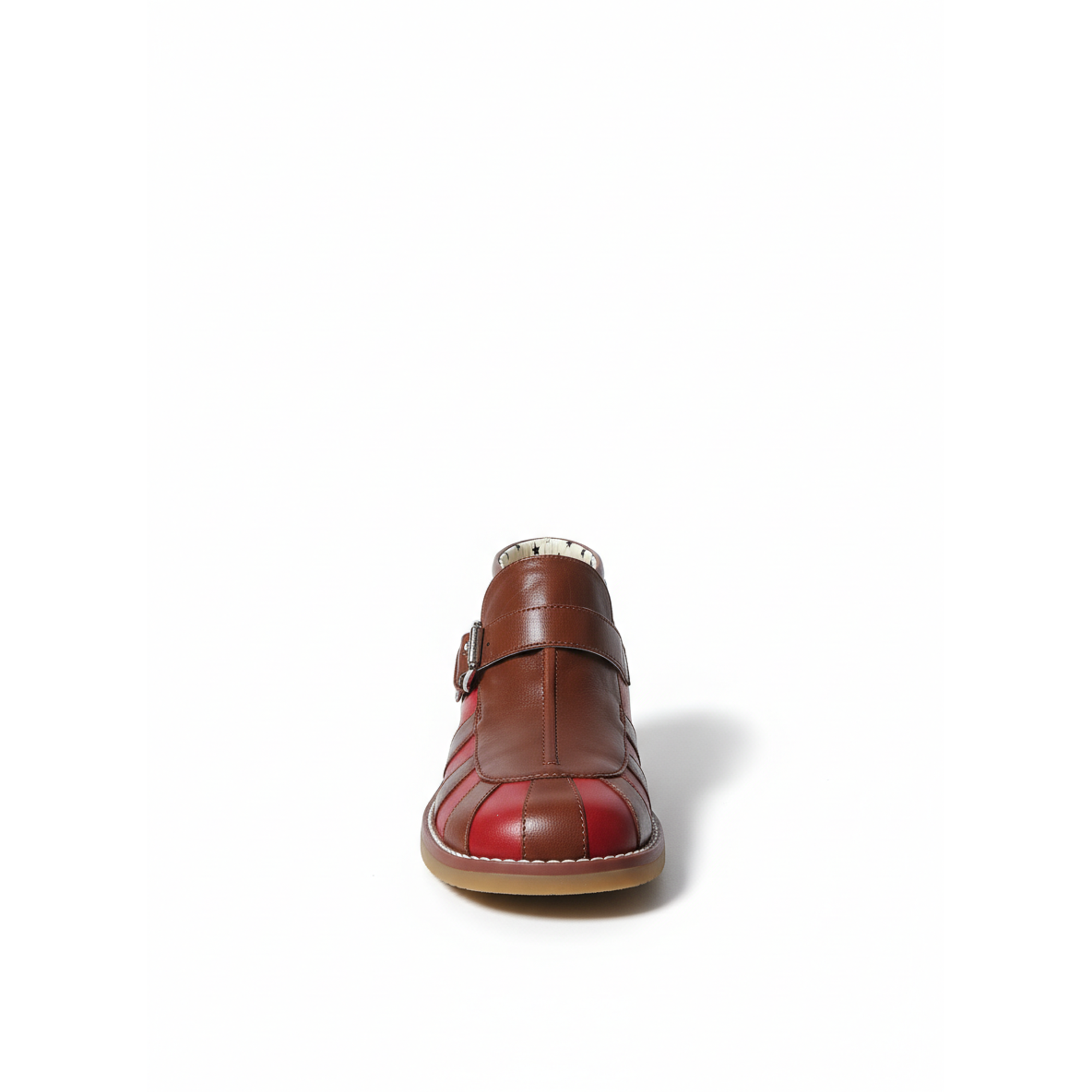 A charming pair of children's ankle boots, crafted in a bold red and brown colorblock design. The star-printed lining adds a playful touch.