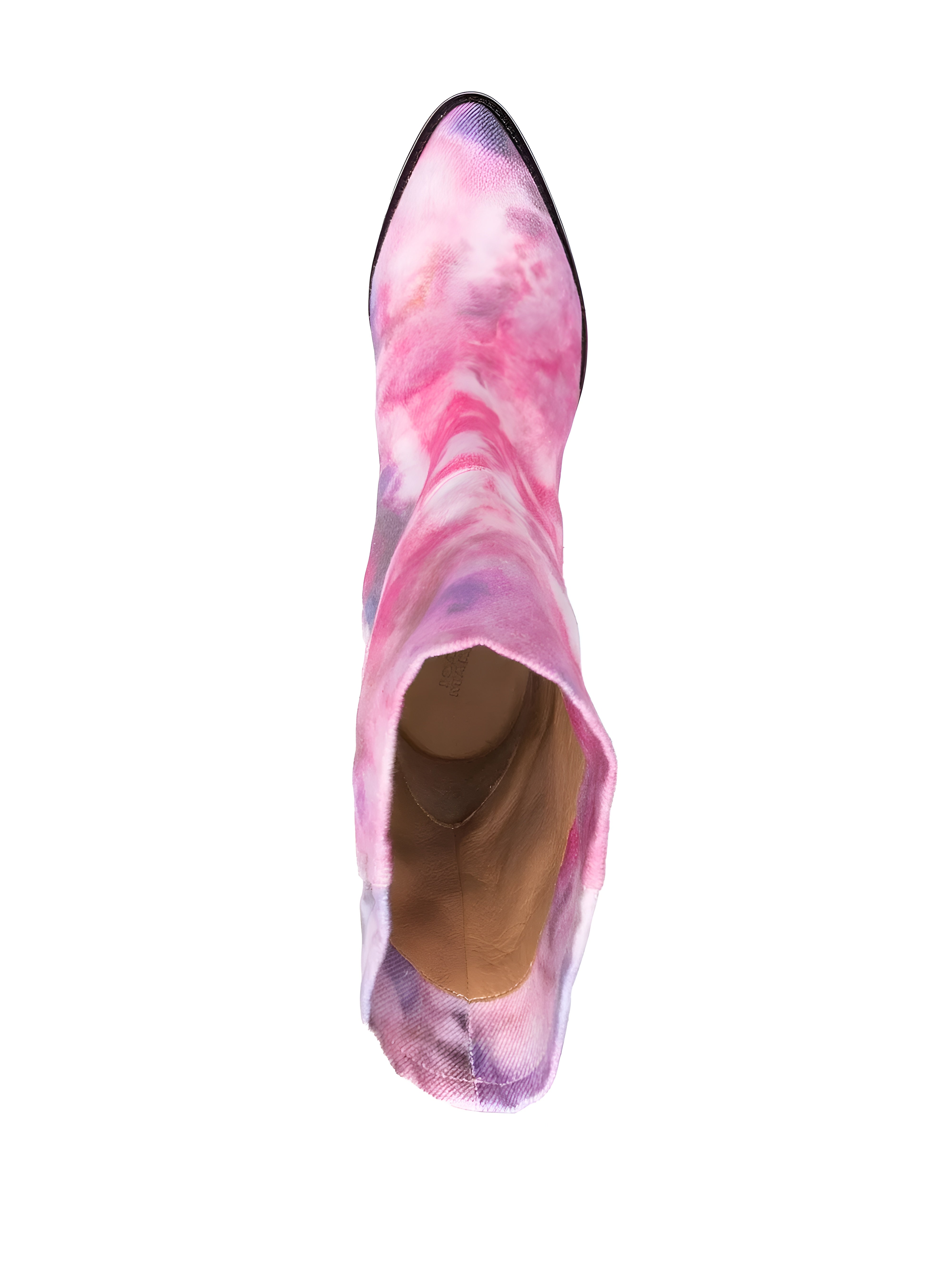 These ankle boots feature a unique tie-dye canvas construction, offering a vibrant and artistic take on a classic silhouette. Designed with a pointed toe and a sculptural cone heel, they evoke a contemporary Western-inspired aesthetic perfect for adding a statement to any ensemble.
