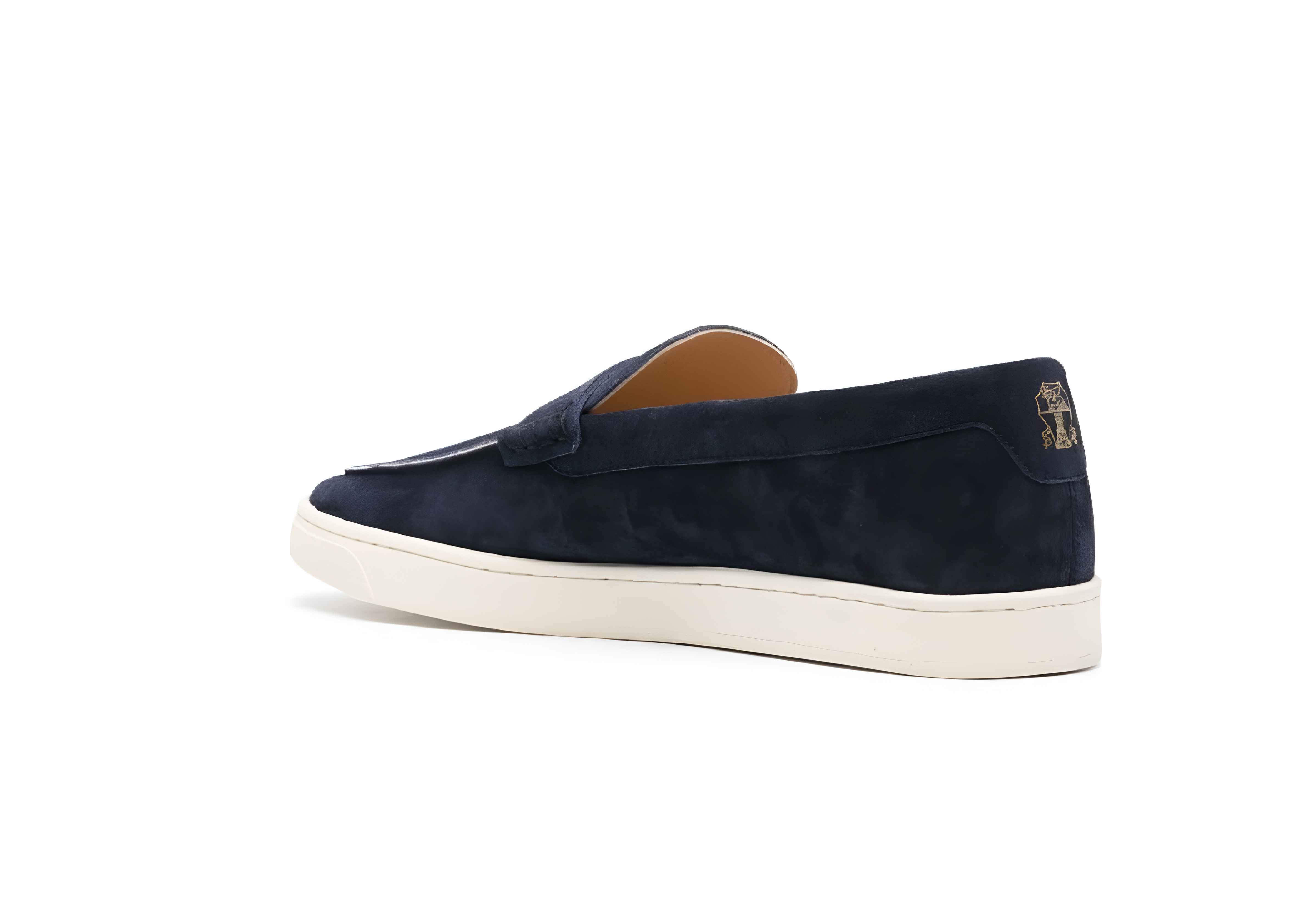 These Brunello Cucinelli suede penny loafers reinterpret a classic silhouette with a contemporary casual edge. Crafted from rich navy suede, the refined upper features traditional penny keeper detailing while maintaining the brand’s signature understated elegance. A clean cream rubber cupsole adds modern comfort and versatility, making this hybrid loafer perfect for relaxed tailoring or elevated weekend wear.