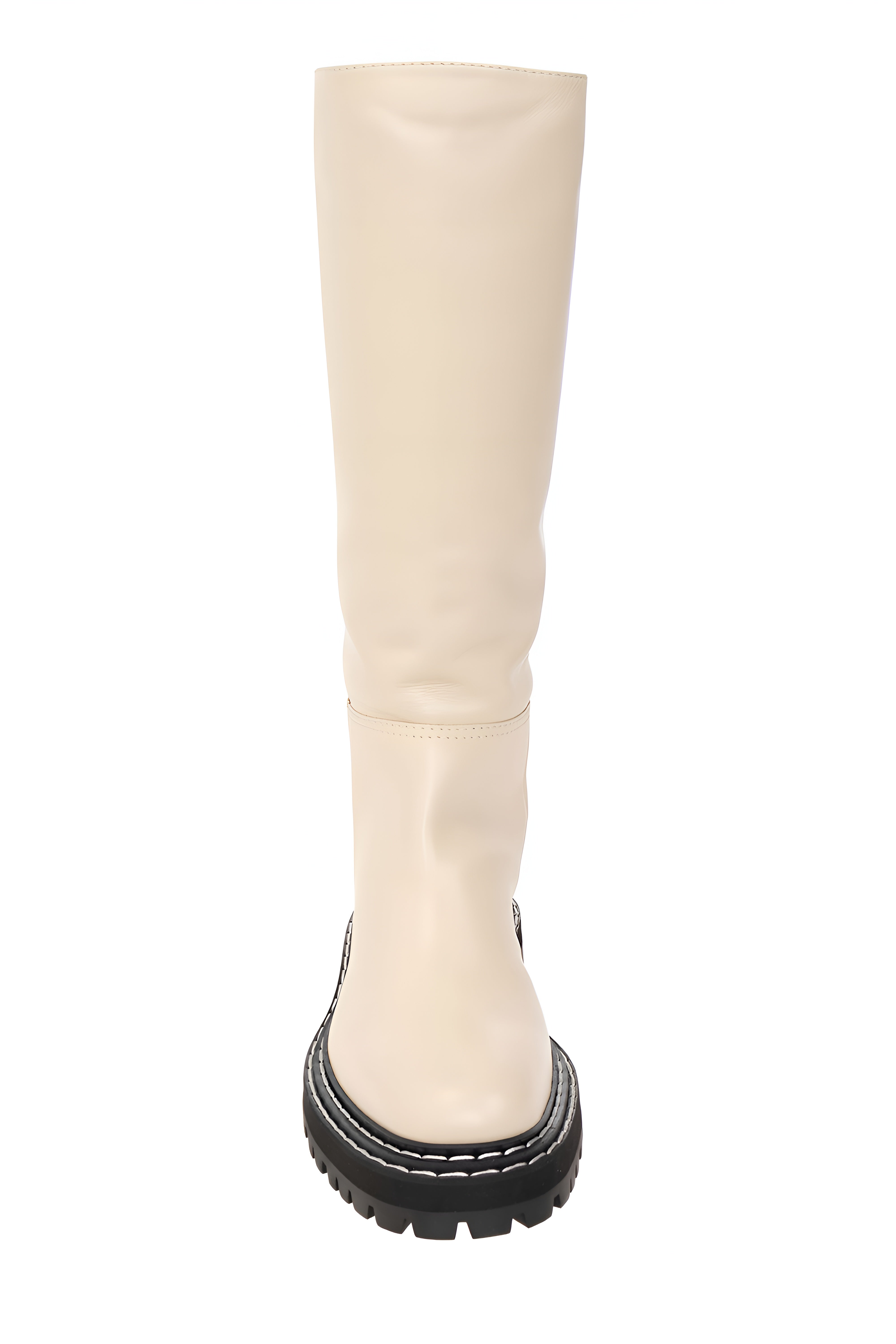 These tall boots are crafted from smooth leather, presenting a sleek yet robust silhouette. They feature a sturdy black lug sole with distinctive contrast white stitching, adding a contemporary utilitarian edge to the design. Ideal for everyday wear, these boots offer both comfort and modern style.