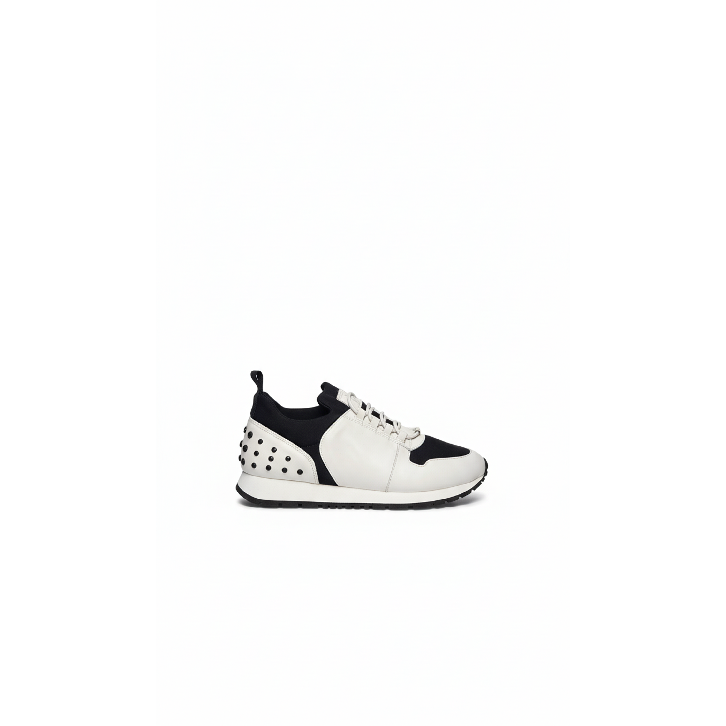These women's low-top sneakers combine smooth leather and breathable textile panels for a refined athletic aesthetic. They feature an elastic lacing system and are distinctively accented with iconic studded detailing on the heel counter, perfect for elevated casual styling.