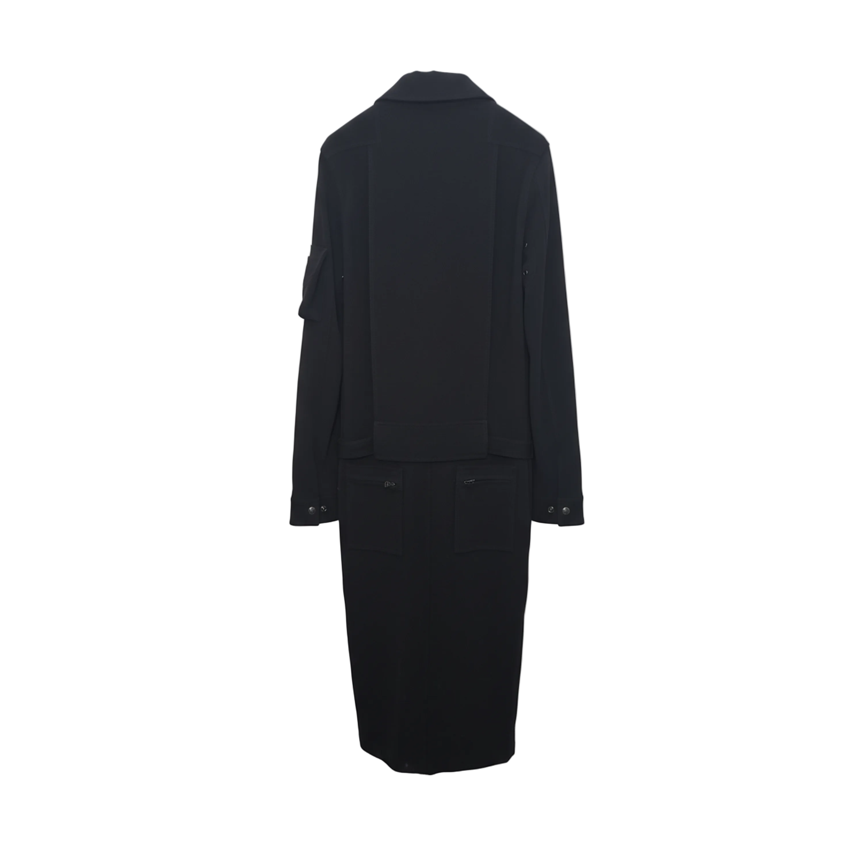 This Tom Ford shirt dress offers a modern take on utilitarian style with its clean lines and functional details. The full-length front zipper and multiple pockets create a look that is both sophisticated and practical.