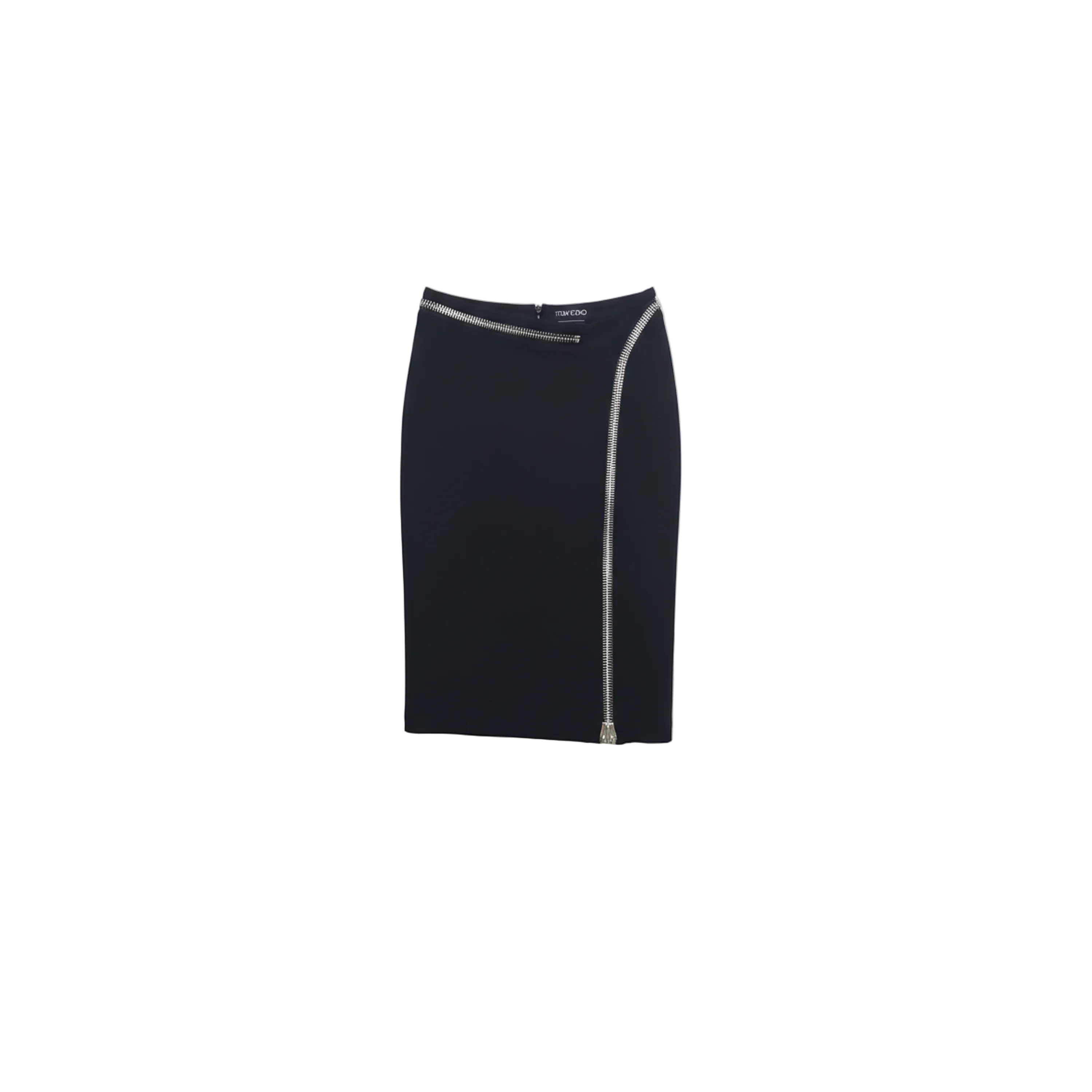 A classic pencil skirt is updated with a bold, contemporary edge. The polished silver-tone zipper trim along the waistline provides a striking contrast against the sleek black fabric.