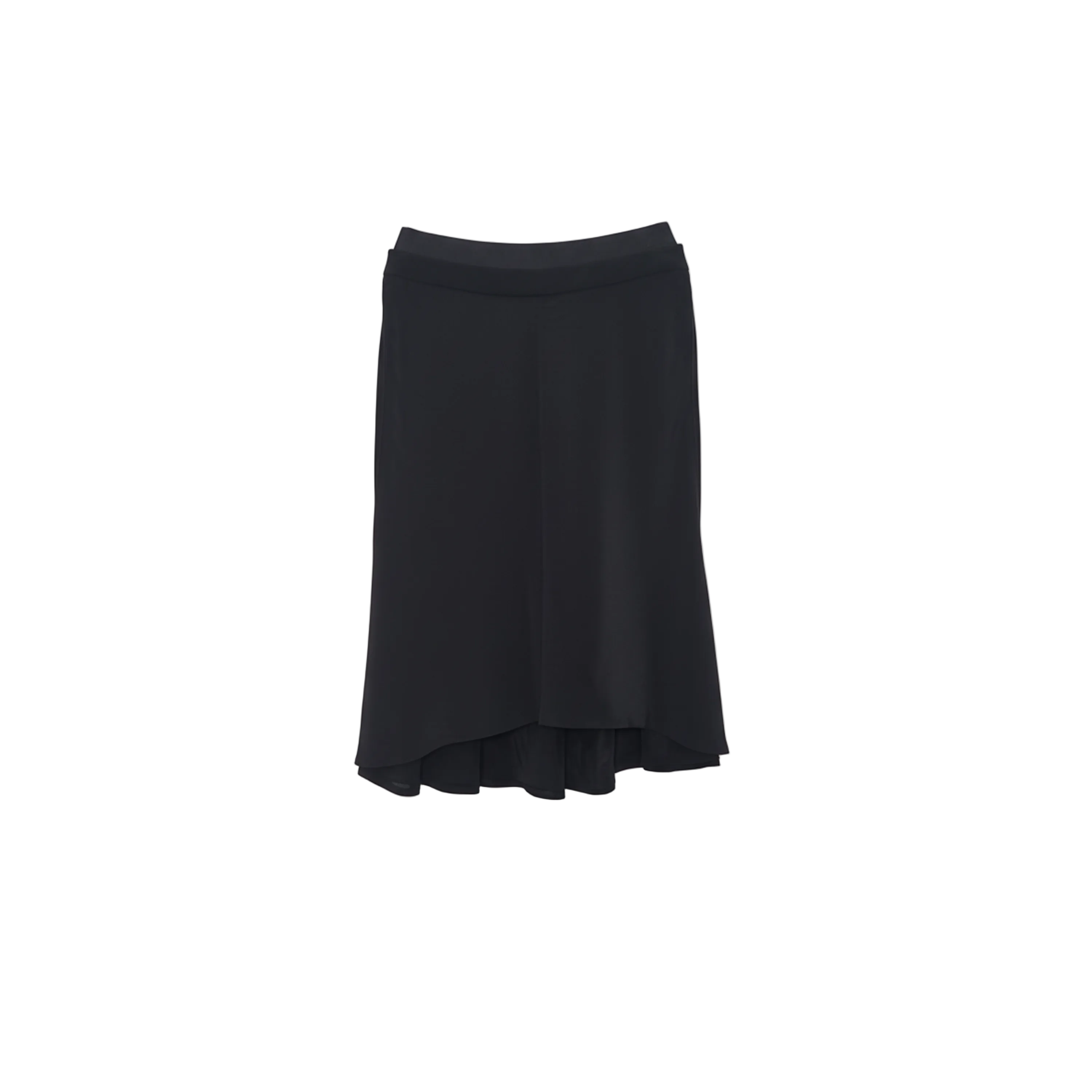 This black skirt features an elegant, flowing silhouette with a sophisticated wrap effect. The asymmetrical hemline adds a modern touch, making it a versatile piece for various occasions.
