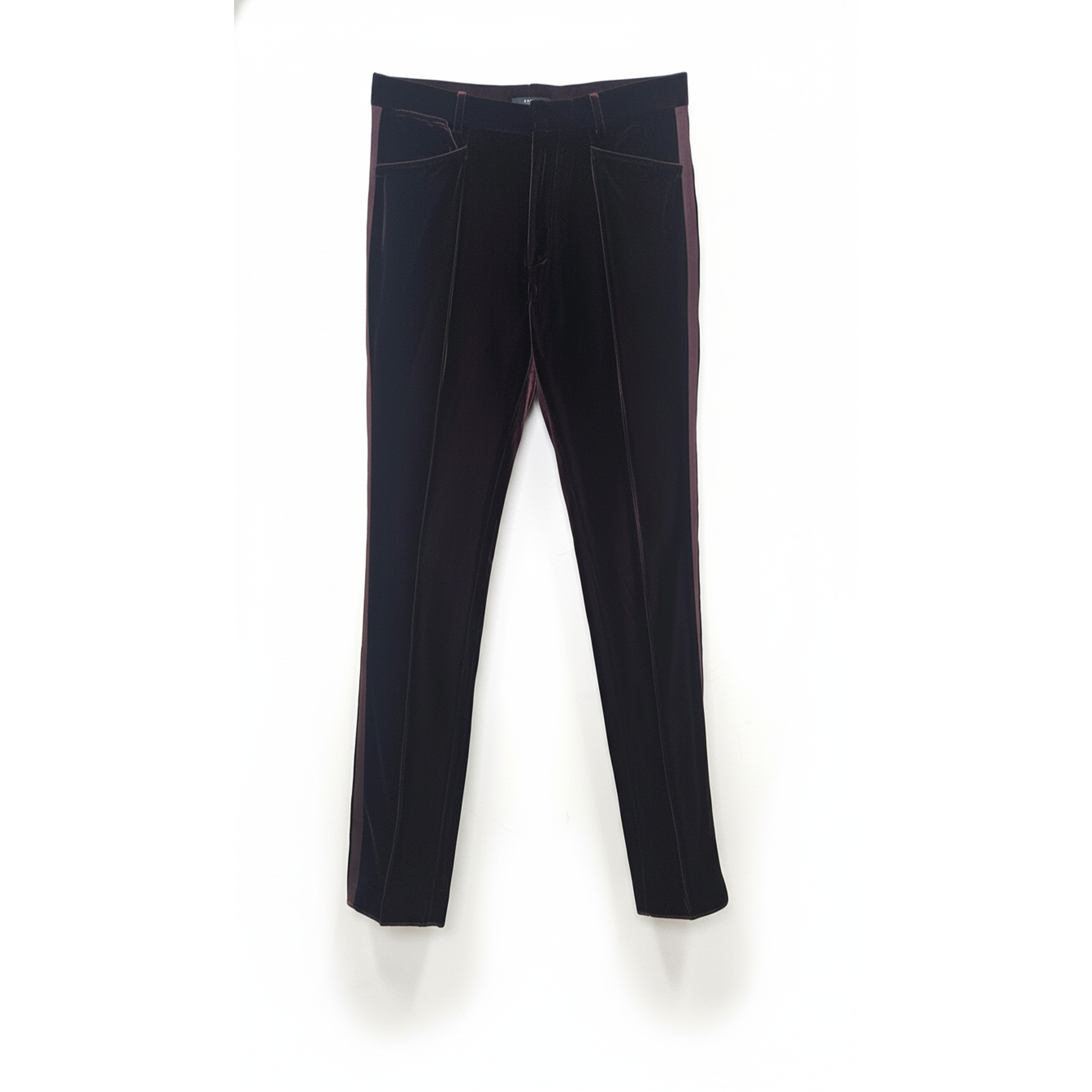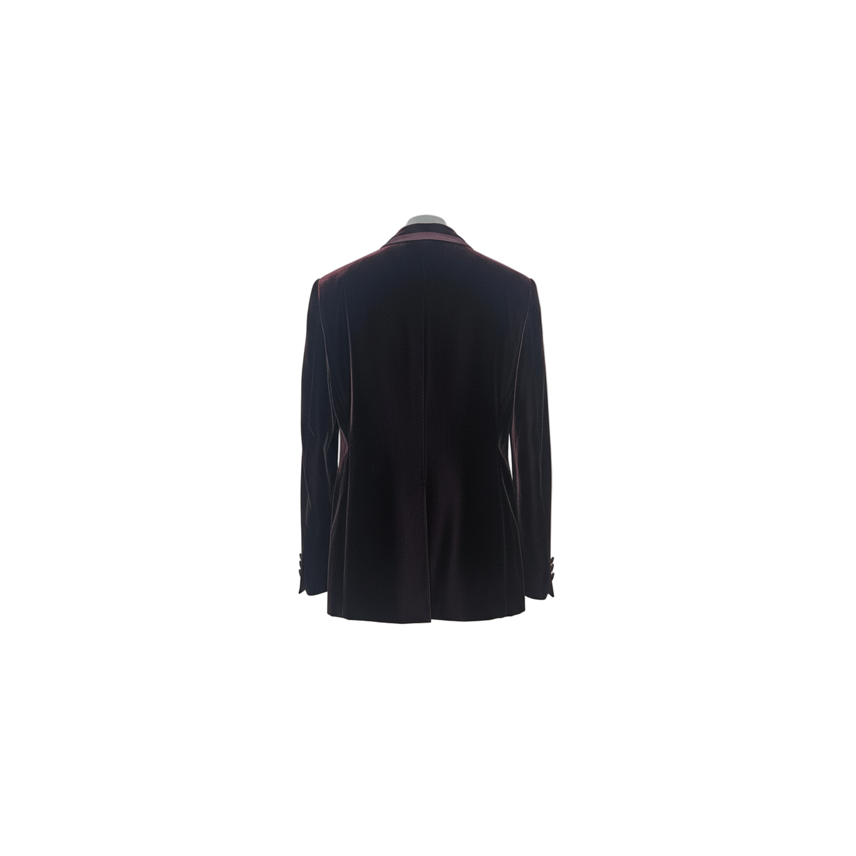 This elegant men's blazer is crafted from rich burgundy velvet, offering a sophisticated and refined aesthetic. It features a single-breasted silhouette with a two-button closure, prominent peaked lapels in a contrasting pink satin, and classic flap pockets, making it ideal for formal occasions or upscale evening wear.