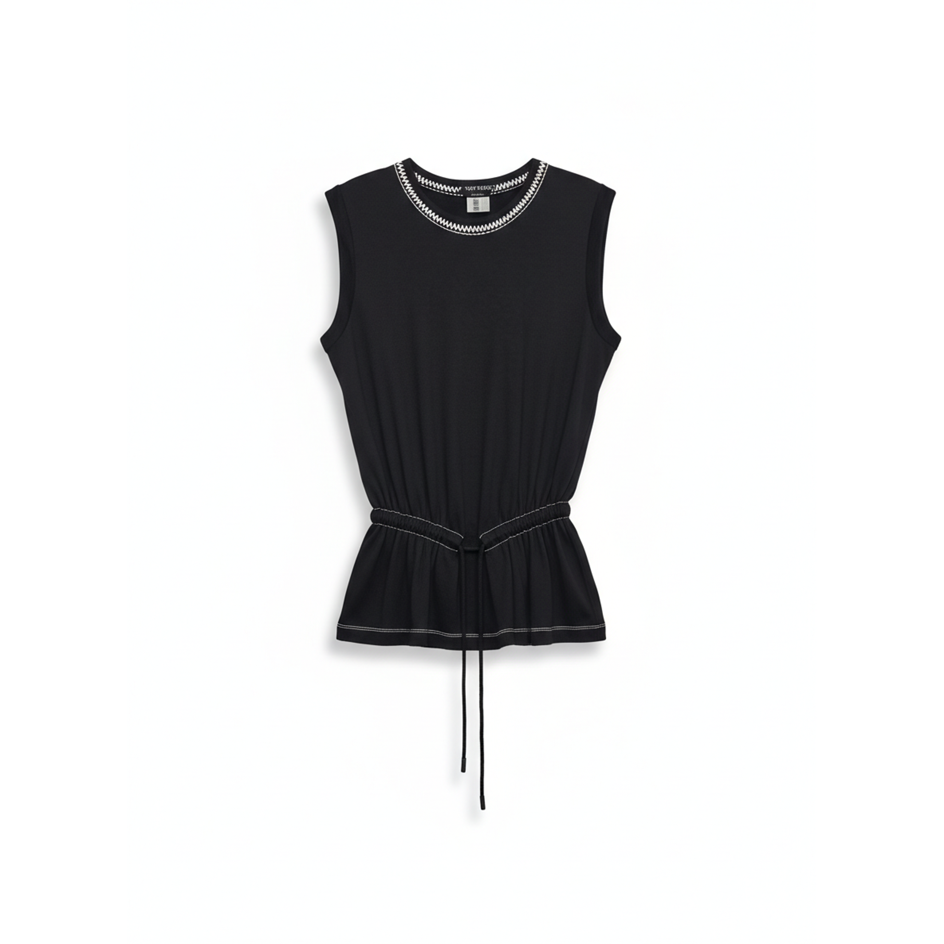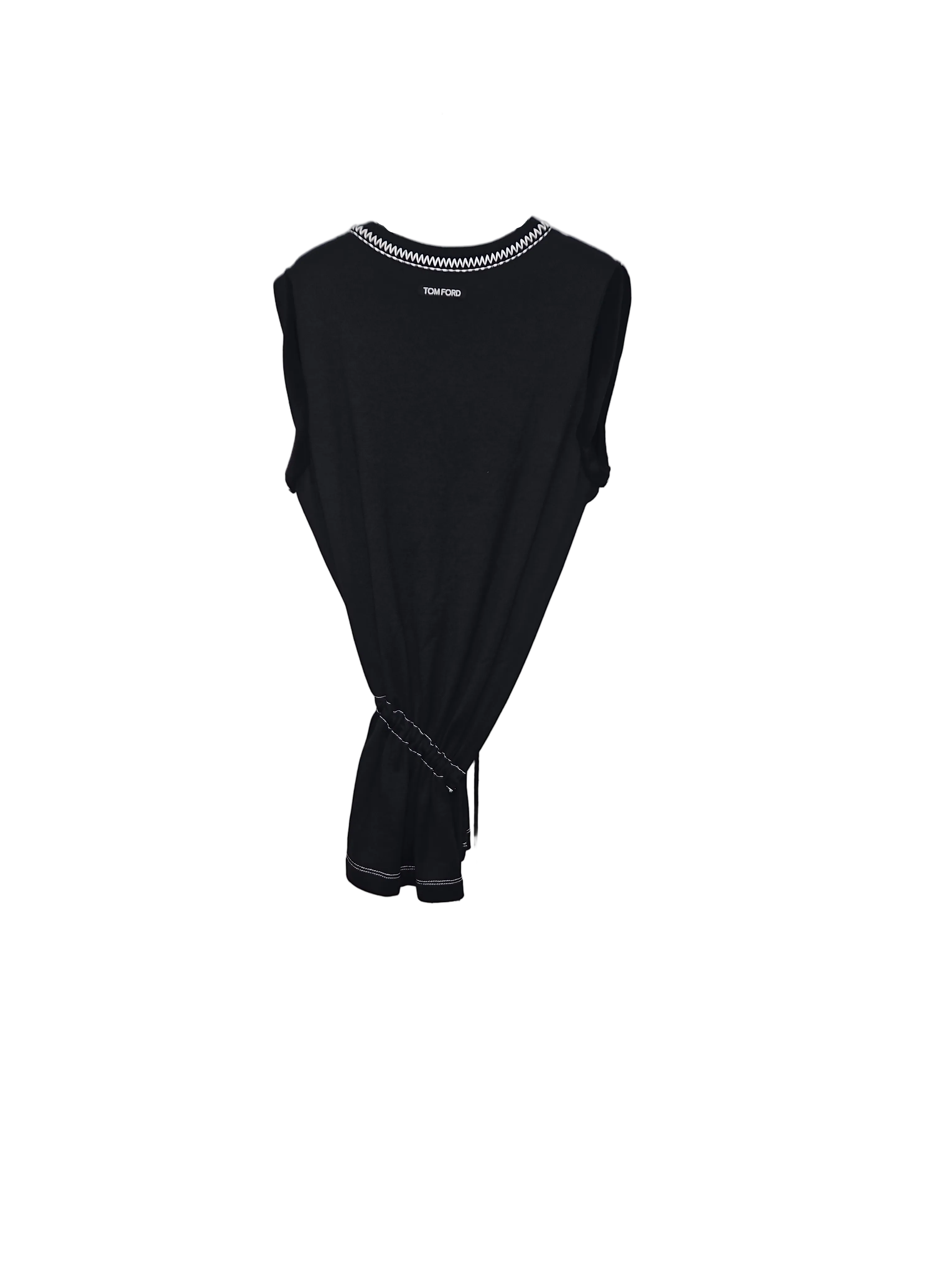 This elegant sleeveless top by Tom Ford showcases a refined balance of minimalism and subtle detail. Crafted in a deep black tone, it features delicate contrast stitching along the neckline and hem, adding a sophisticated edge. The adjustable drawstring waist creates a flattering, cinched silhouette, offering versatility between relaxed and tailored styling. A polished essential ideal for both day and evening wear. It is also opened from the side.