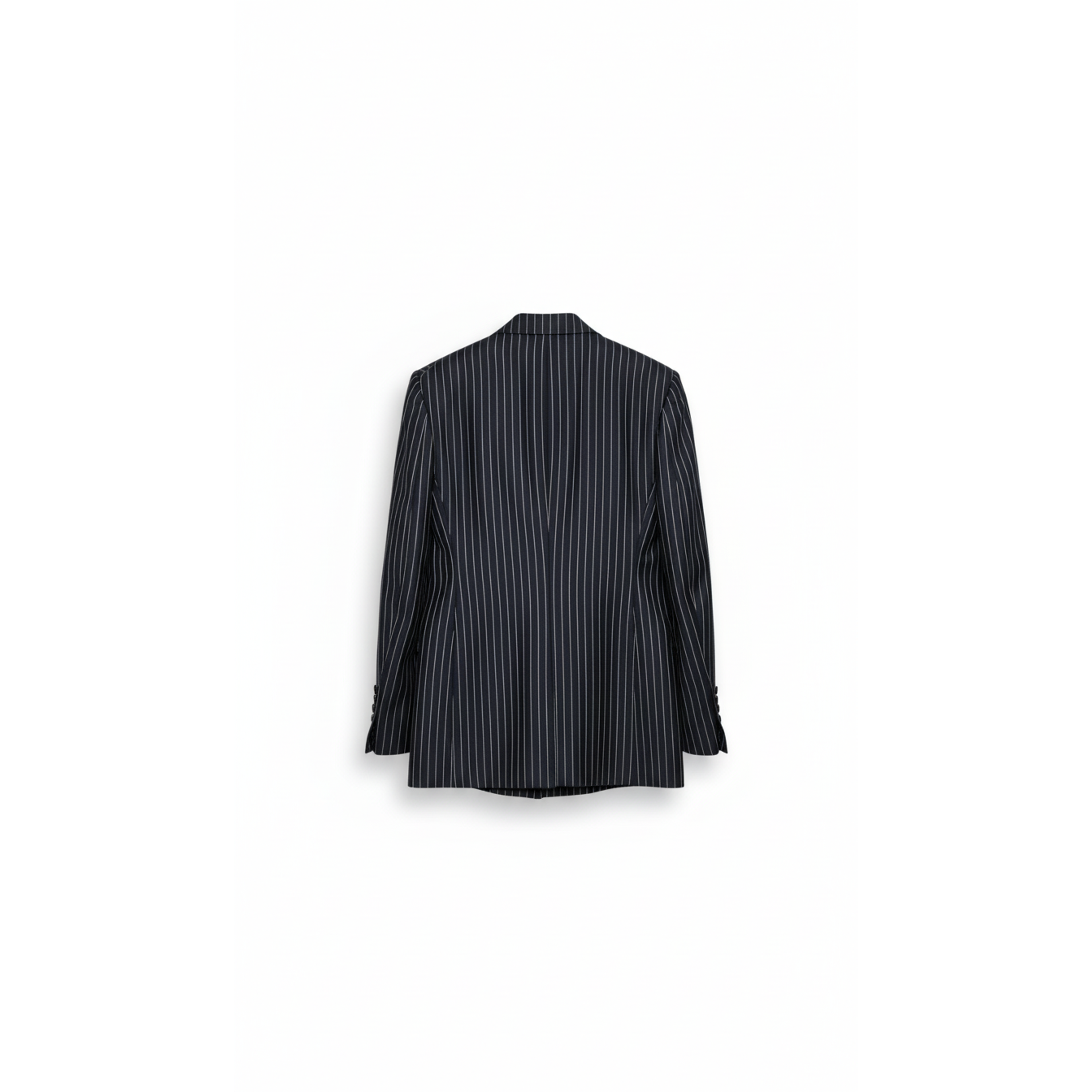 This sophisticated men's double-breasted blazer is expertly tailored from a classic pinstripe fabric. It features sharp peak lapels, a six-button front, and flap pockets, making it an ideal choice for formal or business occasions.