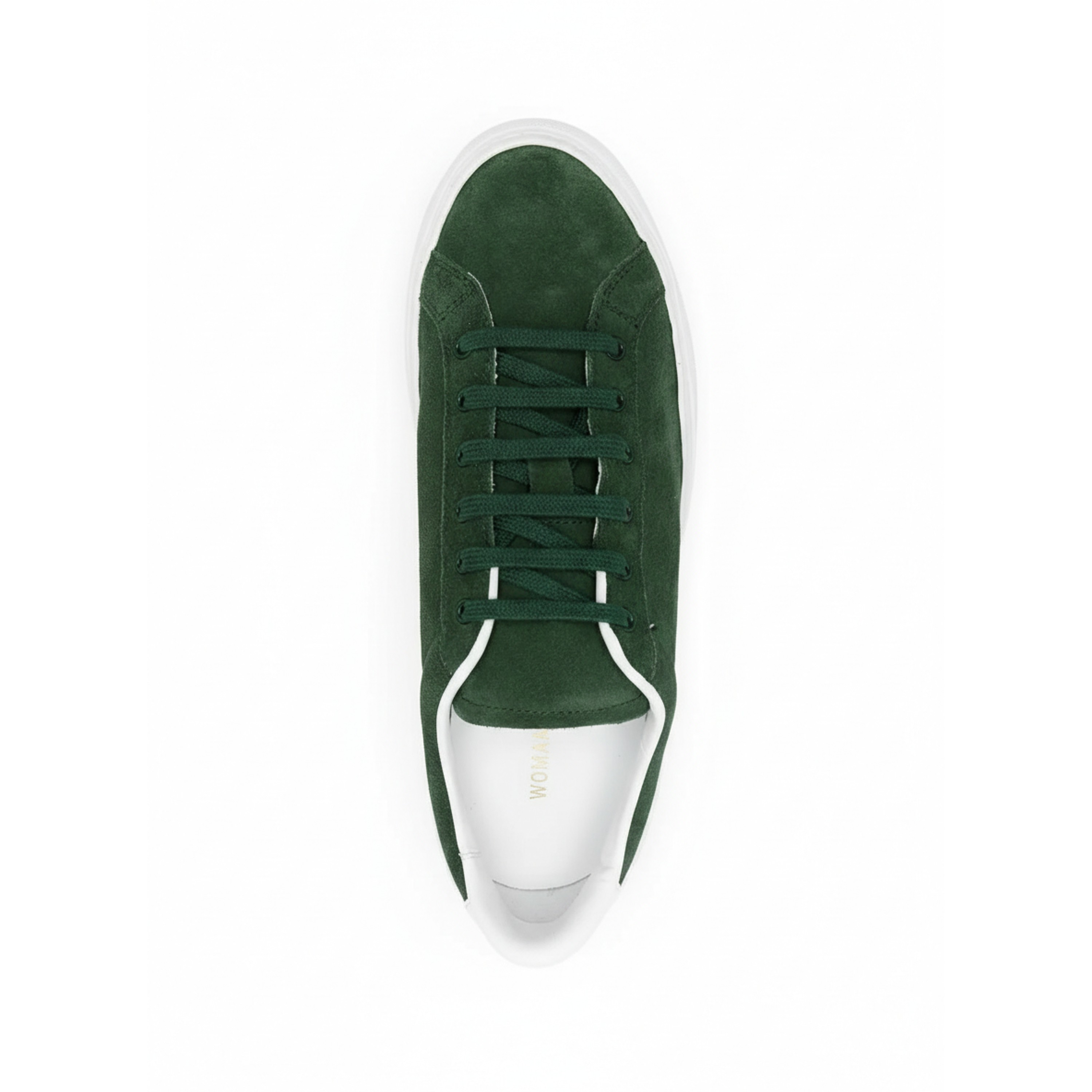 These refined low-top sneakers are expertly crafted from plush green suede, presenting a sophisticated yet minimalist appeal. They are designed with a traditional lace-up front, a pristine white rubber sole, and the brand's iconic gold-tone serial number discreetly stamped on the heel counter, making them an ideal choice for elevated casual ensembles.