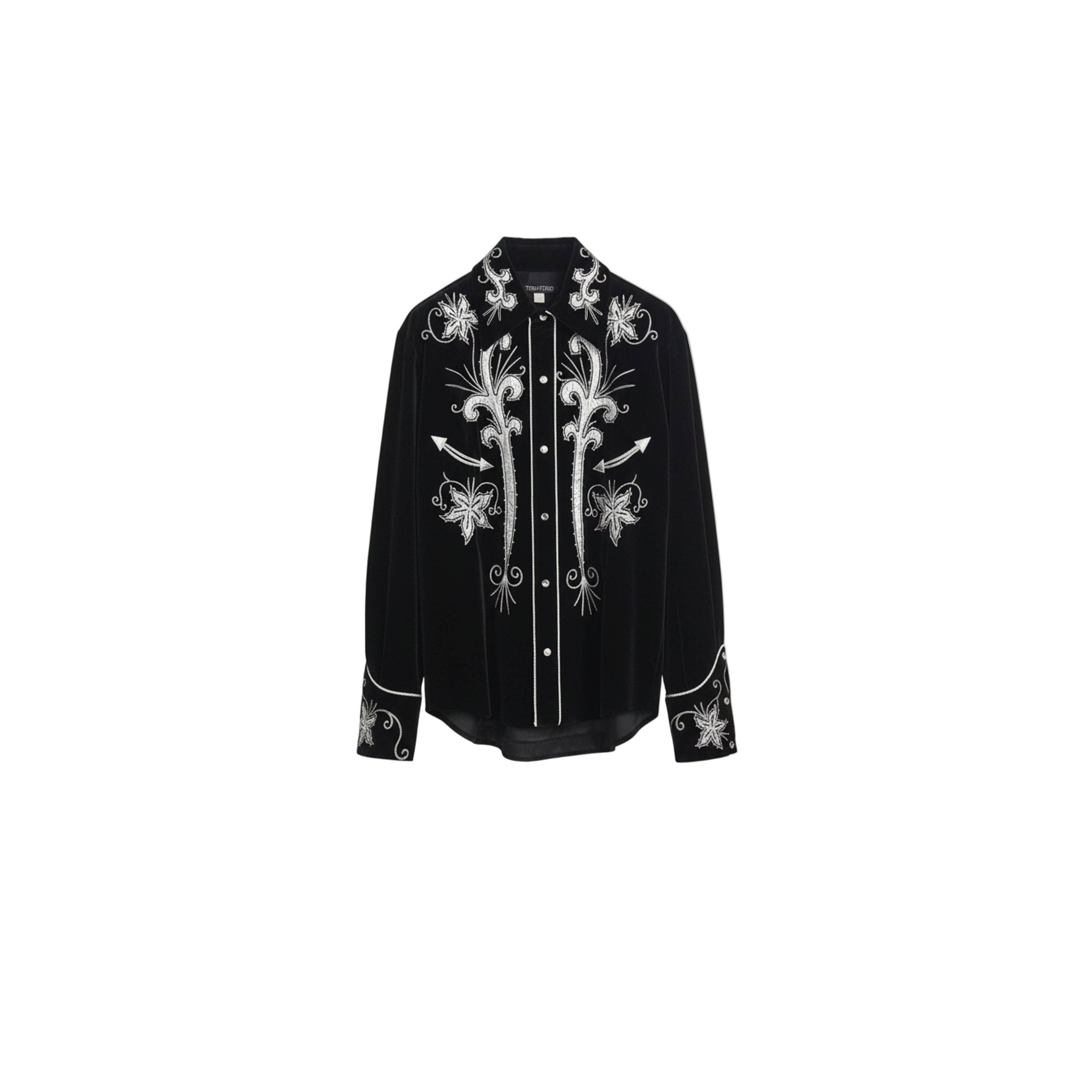 This women's Tom Ford shirt is crafted from luxurious black velvet, offering a rich and sophisticated texture. It features intricate silver embroidery in an ornate Western-inspired pattern across the front, collar, and cuffs. The design is completed with a sharp point collar and decorative button-front closure, presenting a striking and elegant statement piece.