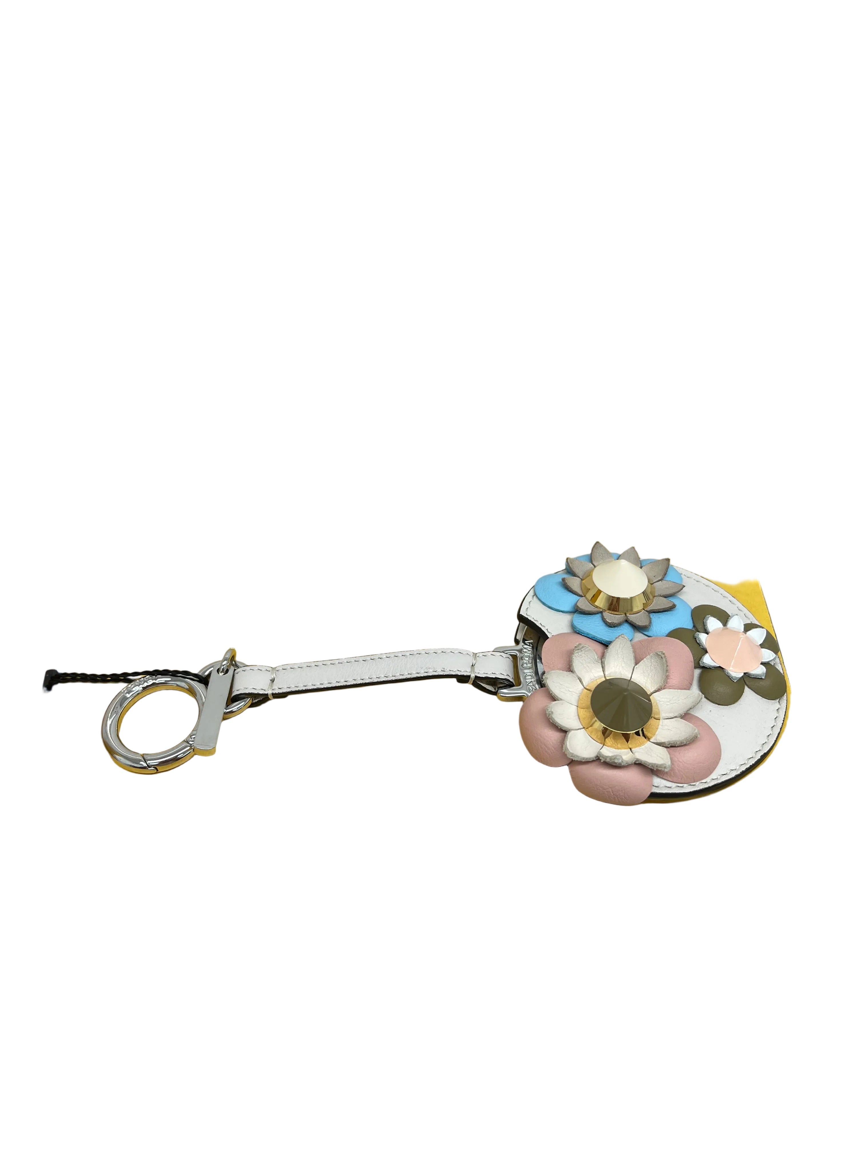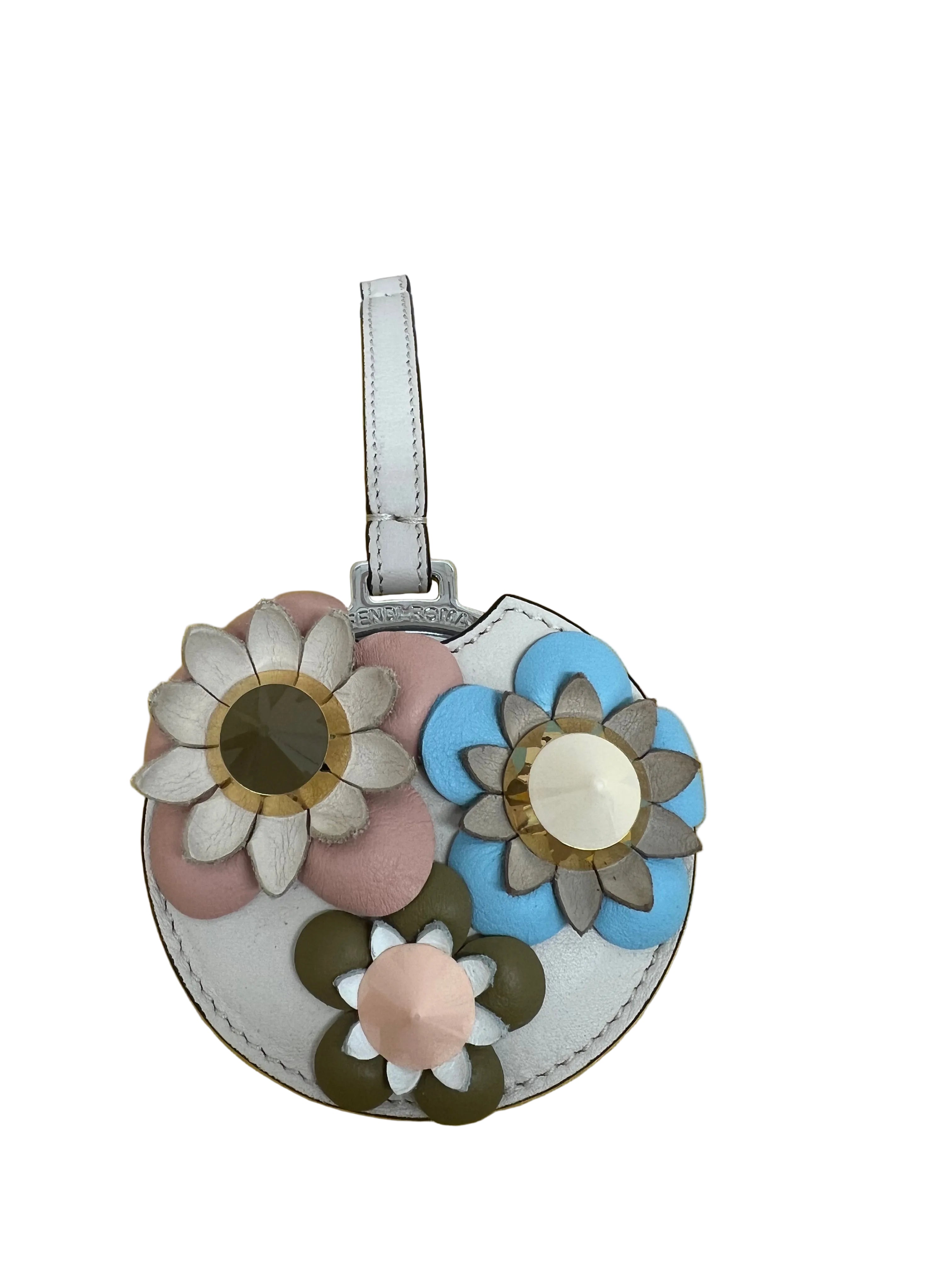 The Fendi multicolor leather flower appliqué mirror bag charm is a versatile accessory that enhances the aesthetic of any bag. Constructed from high-quality leather, this charm features a unique floral design, contributing to both visual appeal and personalization. Its reflective surface adds a functional aspect, allowing for quick checks of appearance while on-the-go.