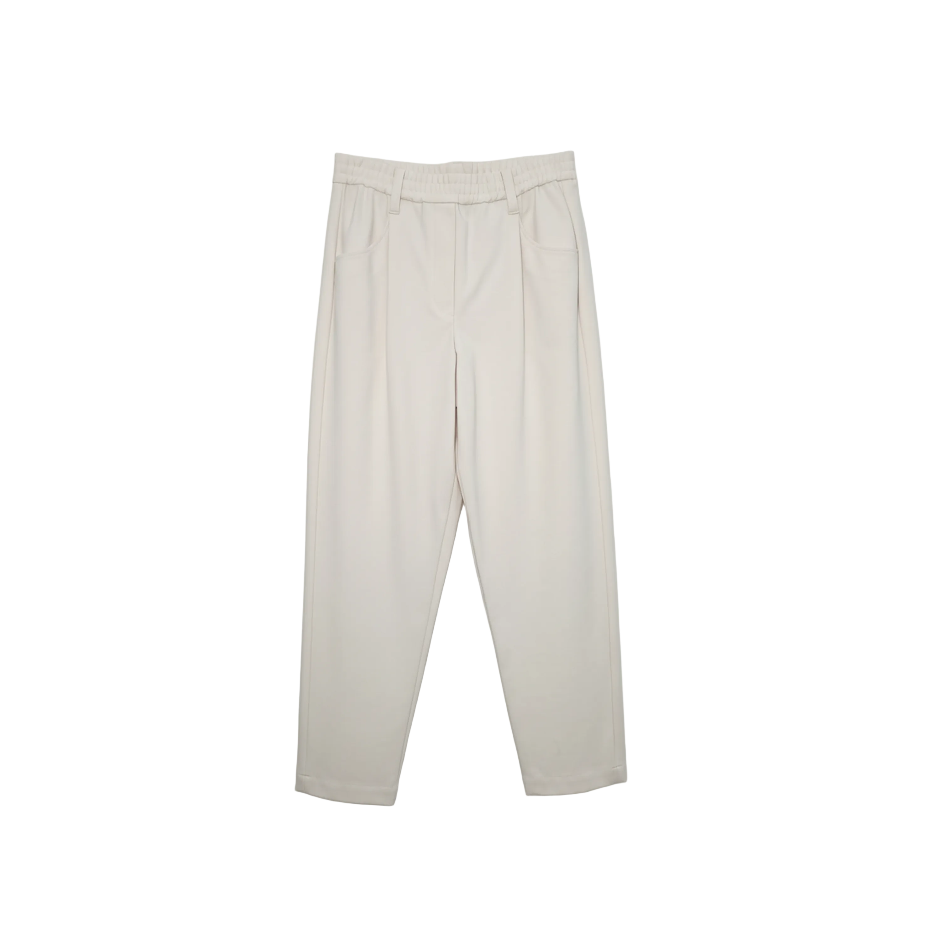 These women's trousers from Brunello Cucinelli offer a relaxed yet refined silhouette. Crafted from a soft fabric blend, they come in a delicate butter hue. They feature a comfortable elasticated high-rise waist and a tapered leg, finished with stylish rolled cuffs, making them perfect for elevated everyday wear.