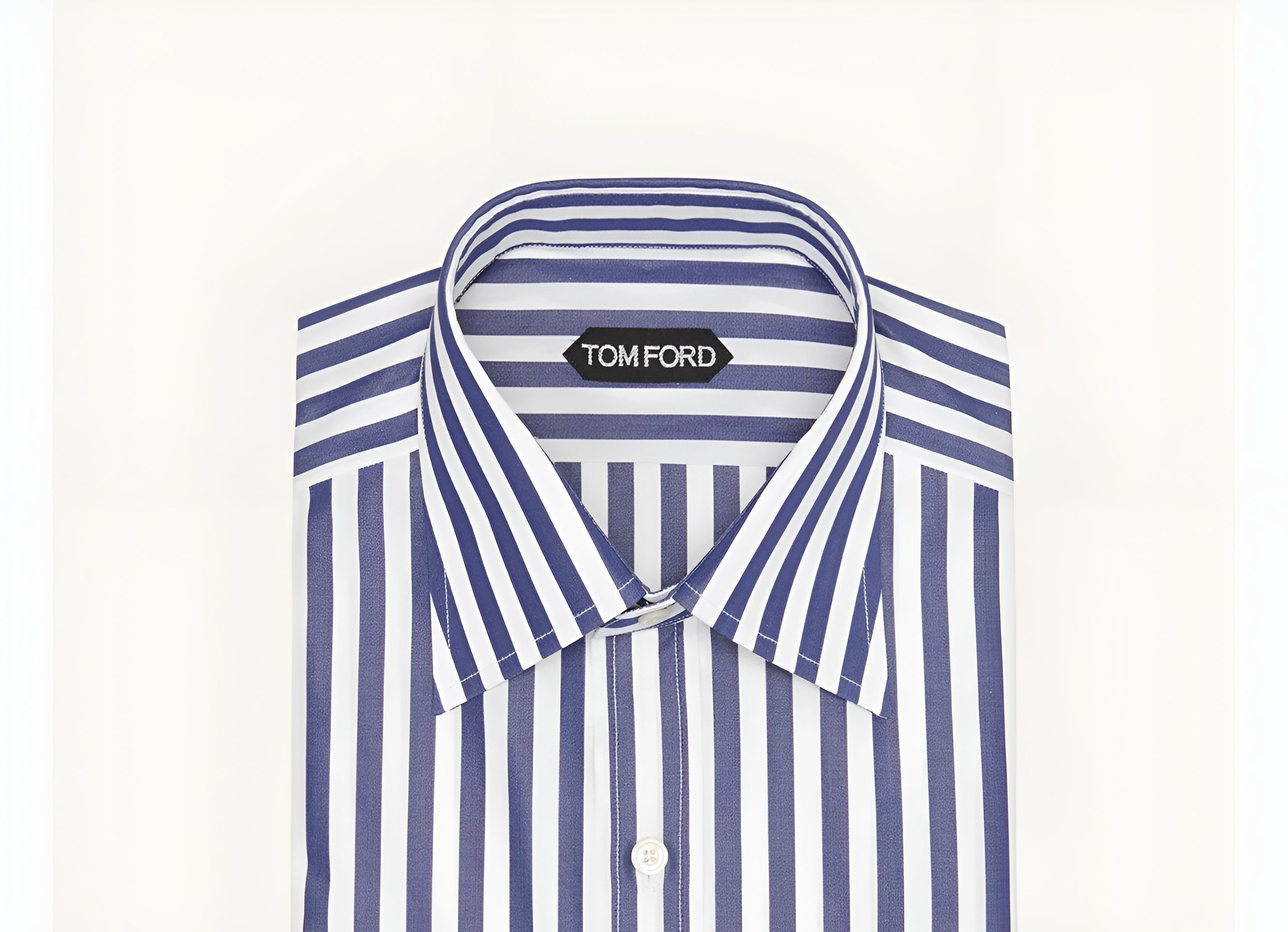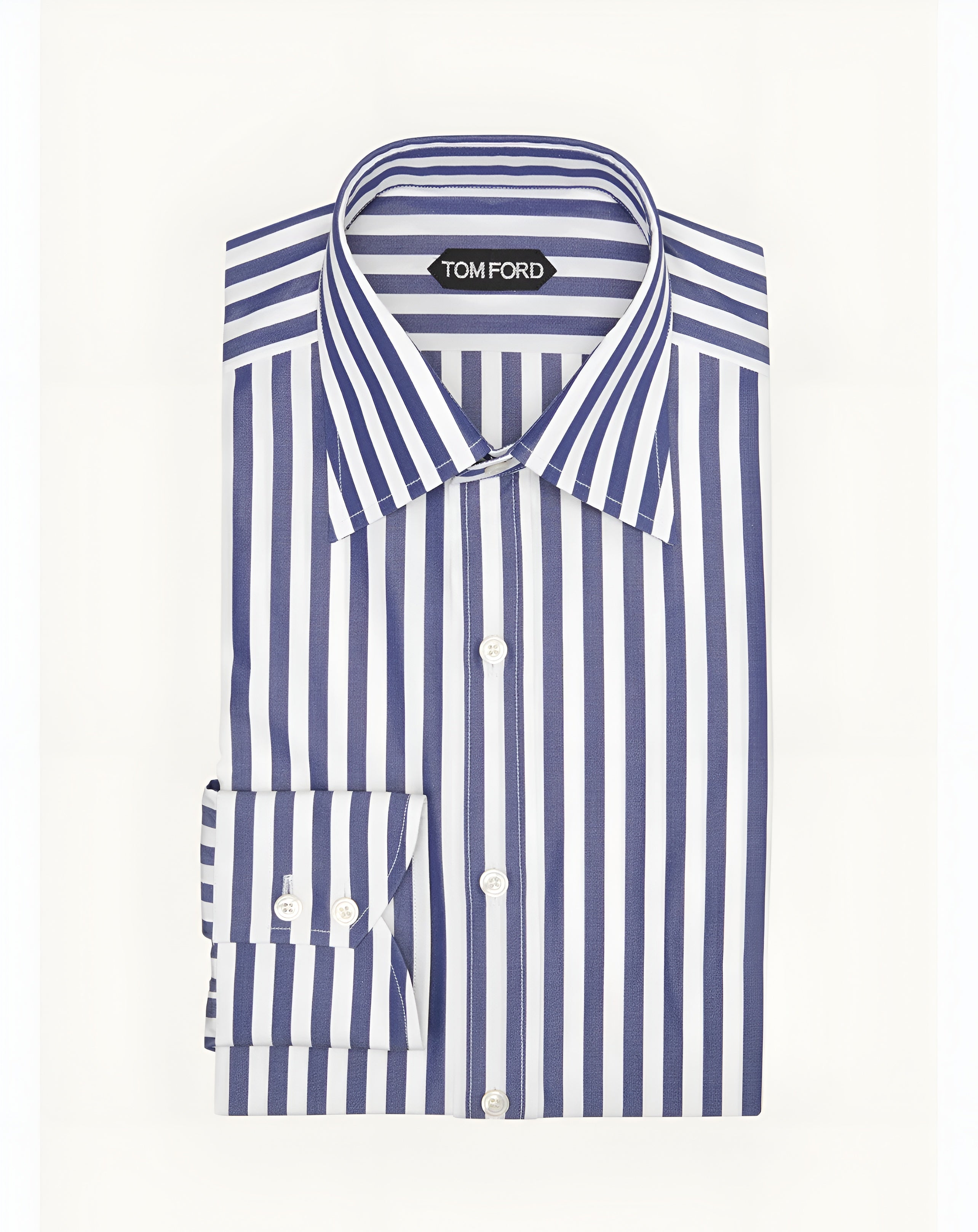 Expertly crafted by Tom Ford, this navy and white Bengal striped button down dress shirt is the epitome of sophisticated style. With its timeless design and high-quality materials, this shirt is sure to elevate any look. Perfect for both formal and casual occasions, it's a must-have addition to any man's wardrobe.