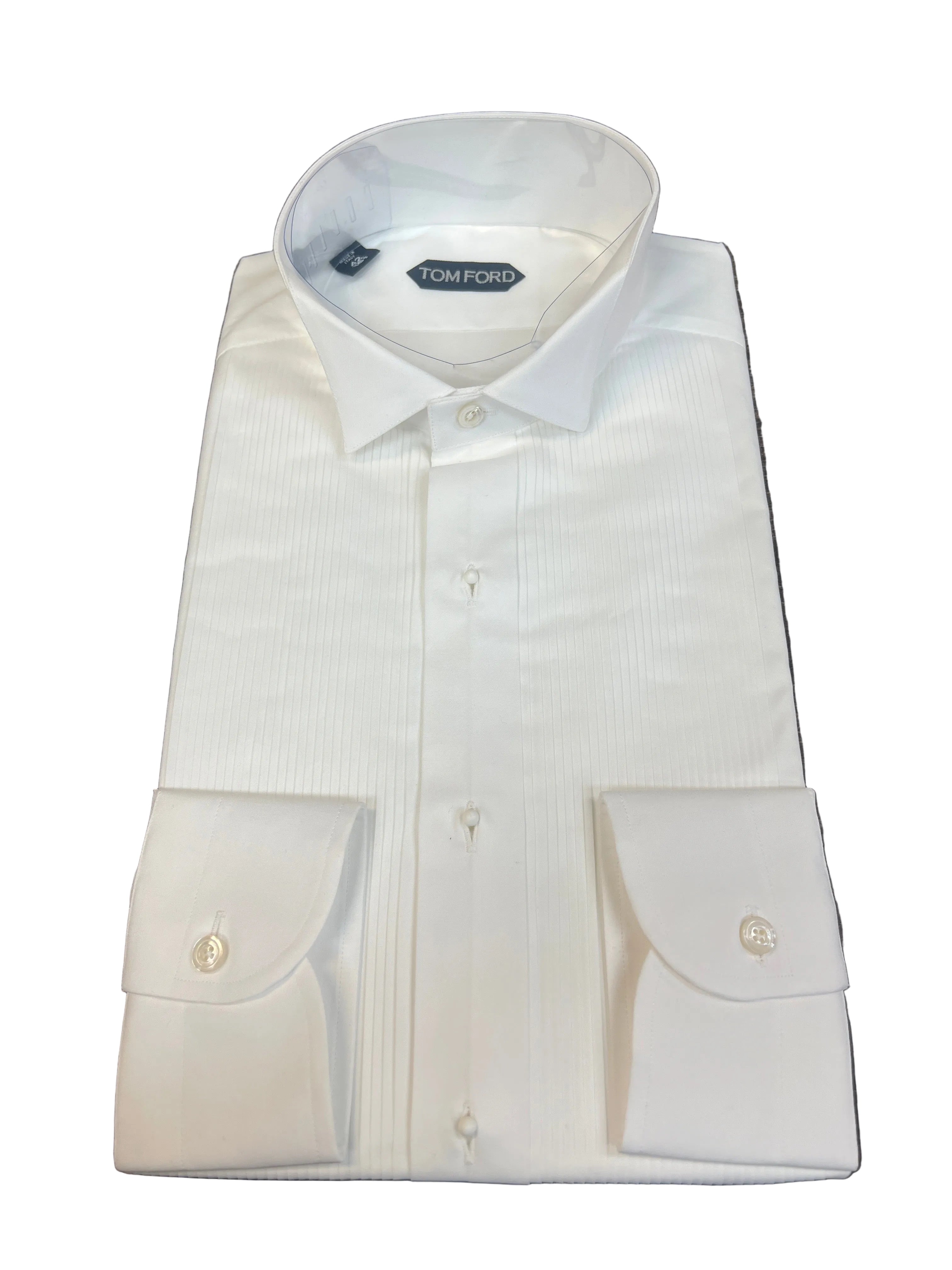 Crafted from crisp white cotton, this Tom Ford tuxedo shirt epitomizes formal elegance. It features a refined pleated bib front, a classic spread collar, and sophisticated French cuffs, making it an essential piece for black-tie events.