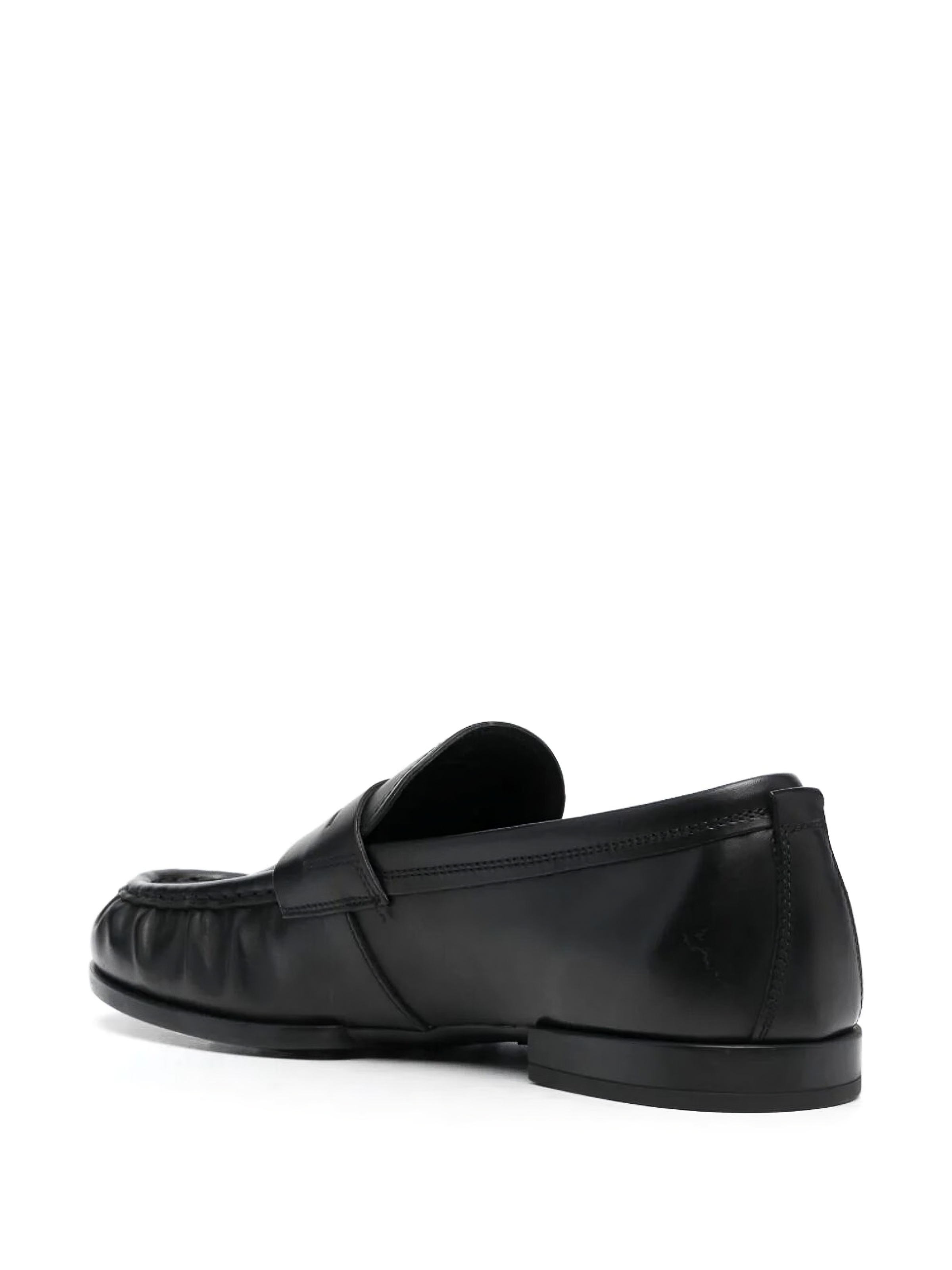 Crafted from smooth black leather, these men's loafers present a sophisticated and versatile profile. They feature a classic penny strap across the vamp and a distinctive pinch-seam toe, set on a low stacked heel for refined everyday wear.