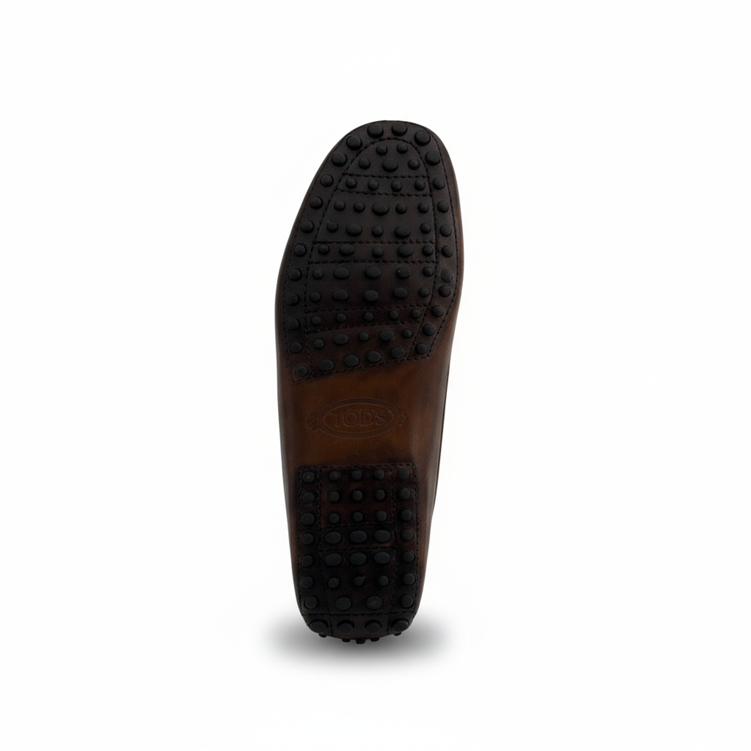 Gommino Tod's in elegant smooth used finish leather with exposed handmade stitching, penny bar, stamped Tod's logo and iconic rubber pebble outsole.